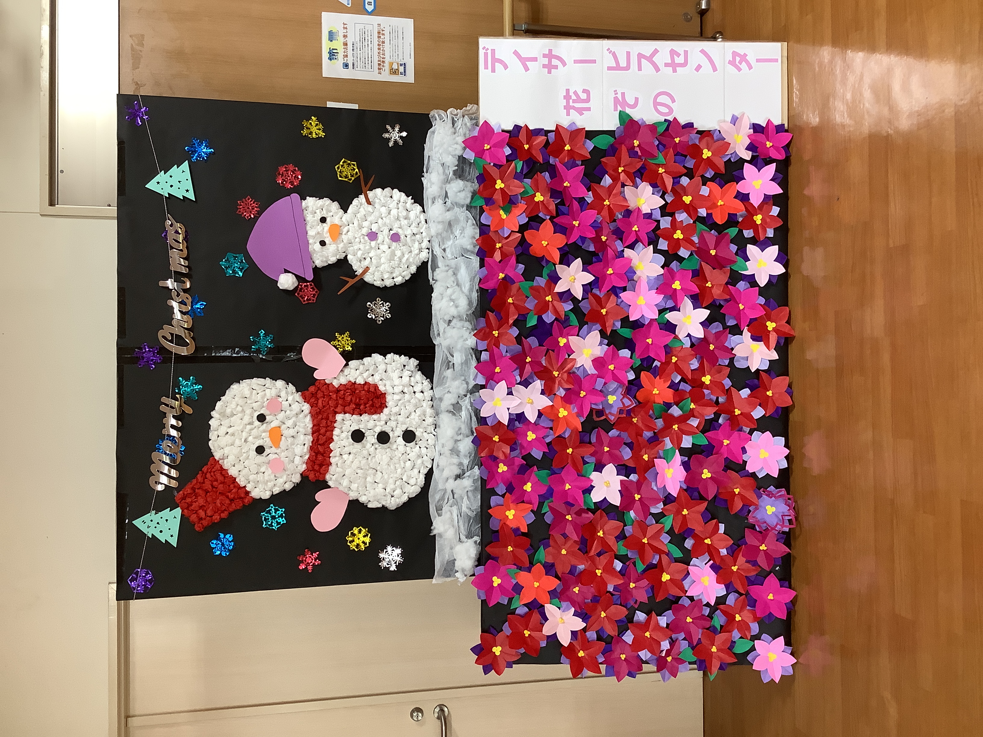 クリスマスをモチーフにした可愛らしい壁面が完成しました!(^^)!利用者様手作りの雪だるまやポインセチアが綺麗に出来ました♪デイサービス入り口に展示してあります(^^♪
