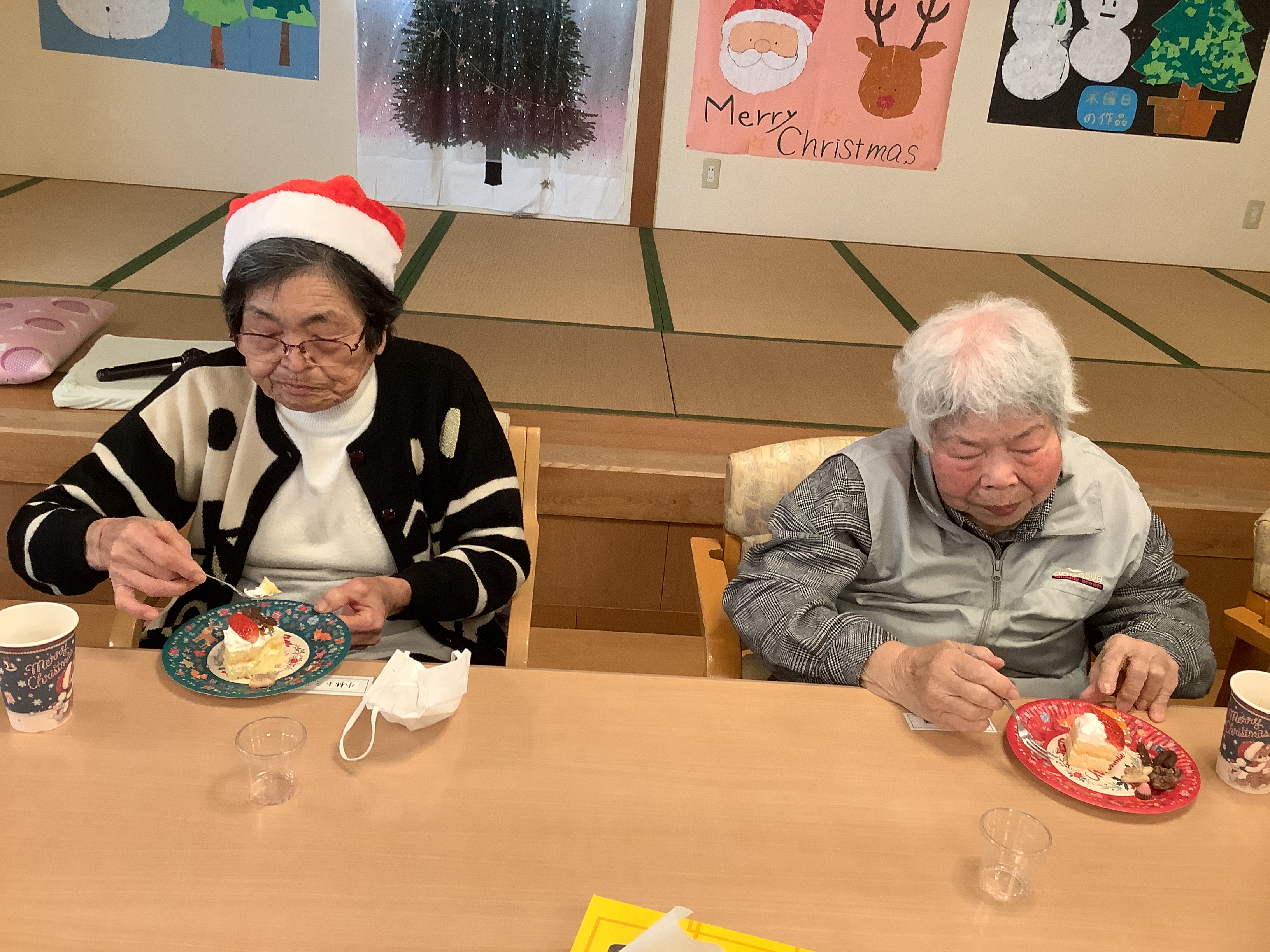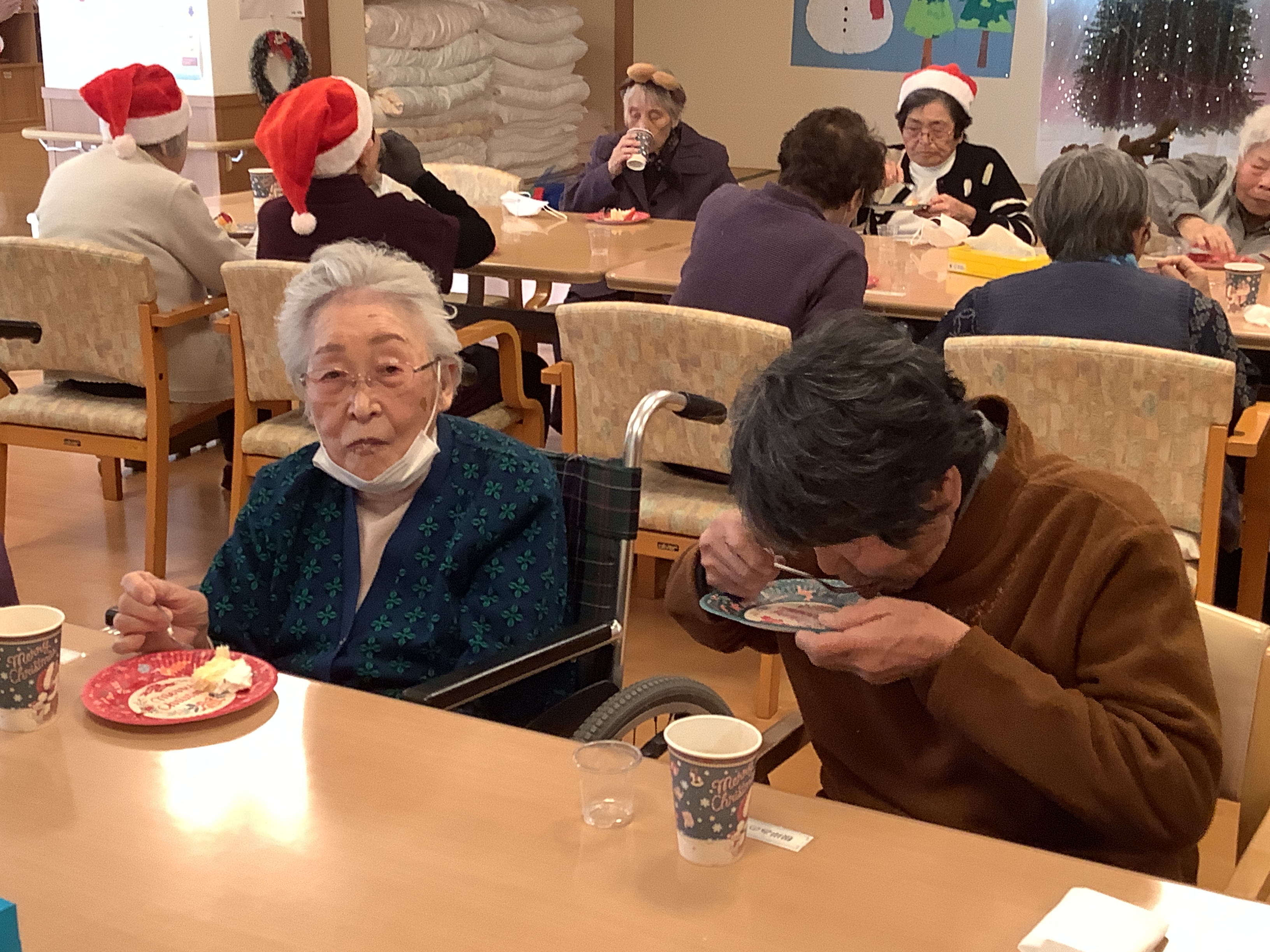 昼食はクリスマスメニューでした(*´▽`*) おやつには、ケーキを豪華にデコレーションにシャンメリーで乾杯しました!(^^)! シャンメリーは好評で「初めて飲んだ」と喜ばれている方もたくさんいらっしゃいました(^^♪