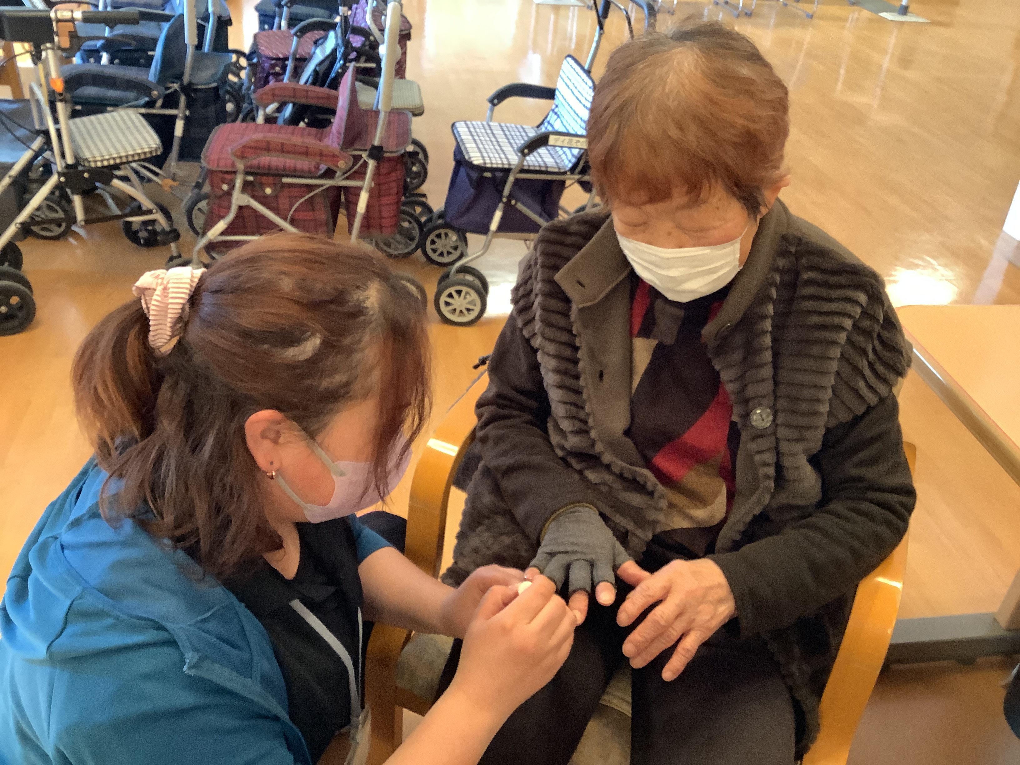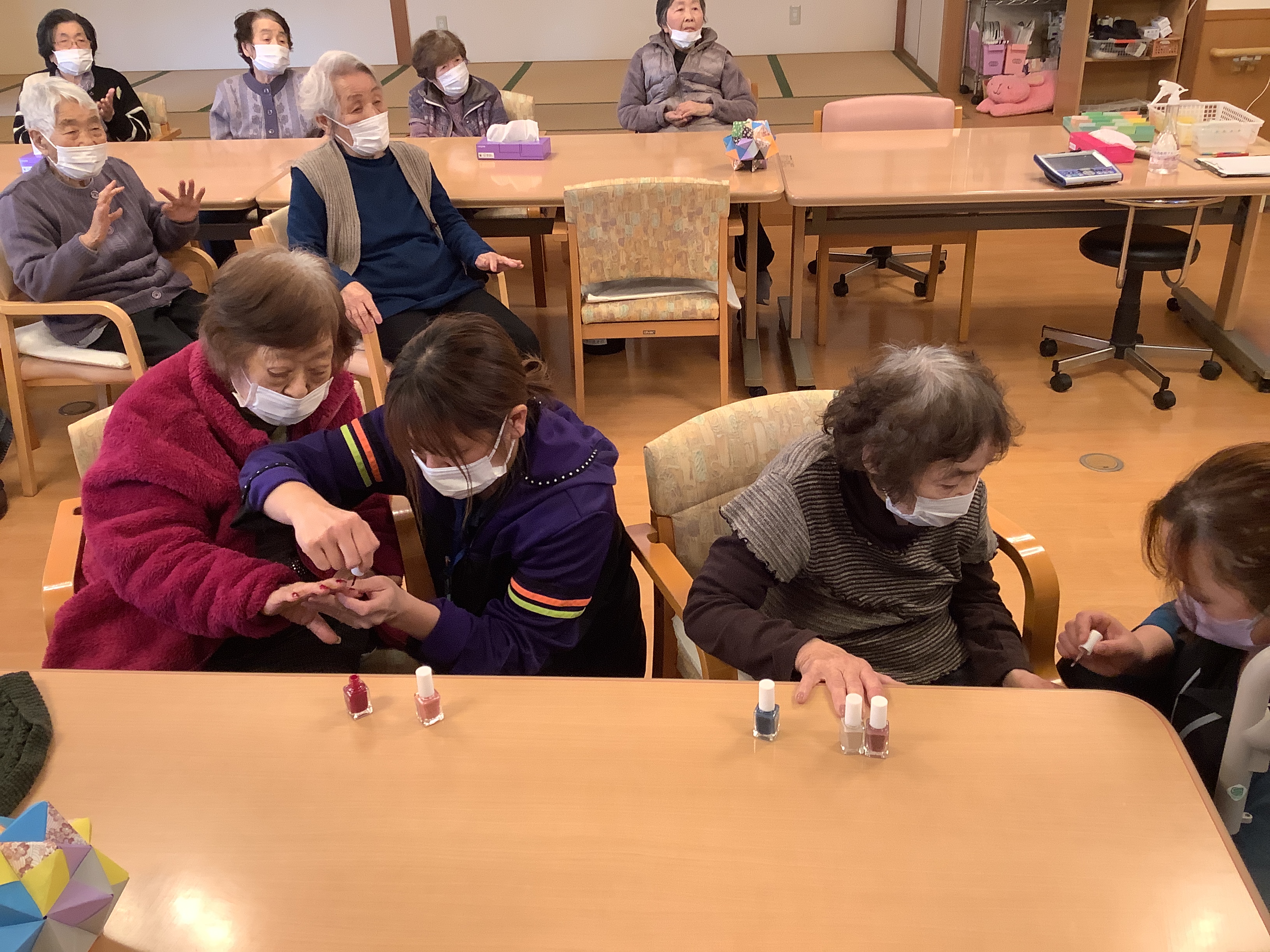 クラブ活動の時間に希望される利用者様にマニキュアを楽しんで頂きました(^^♪ 色を選ぶ時間から皆様、自然とニコニコ笑顔(*´▽`*) おしゃれに年齢は関係ないですね(^^)/ とっても喜ばれていました♪