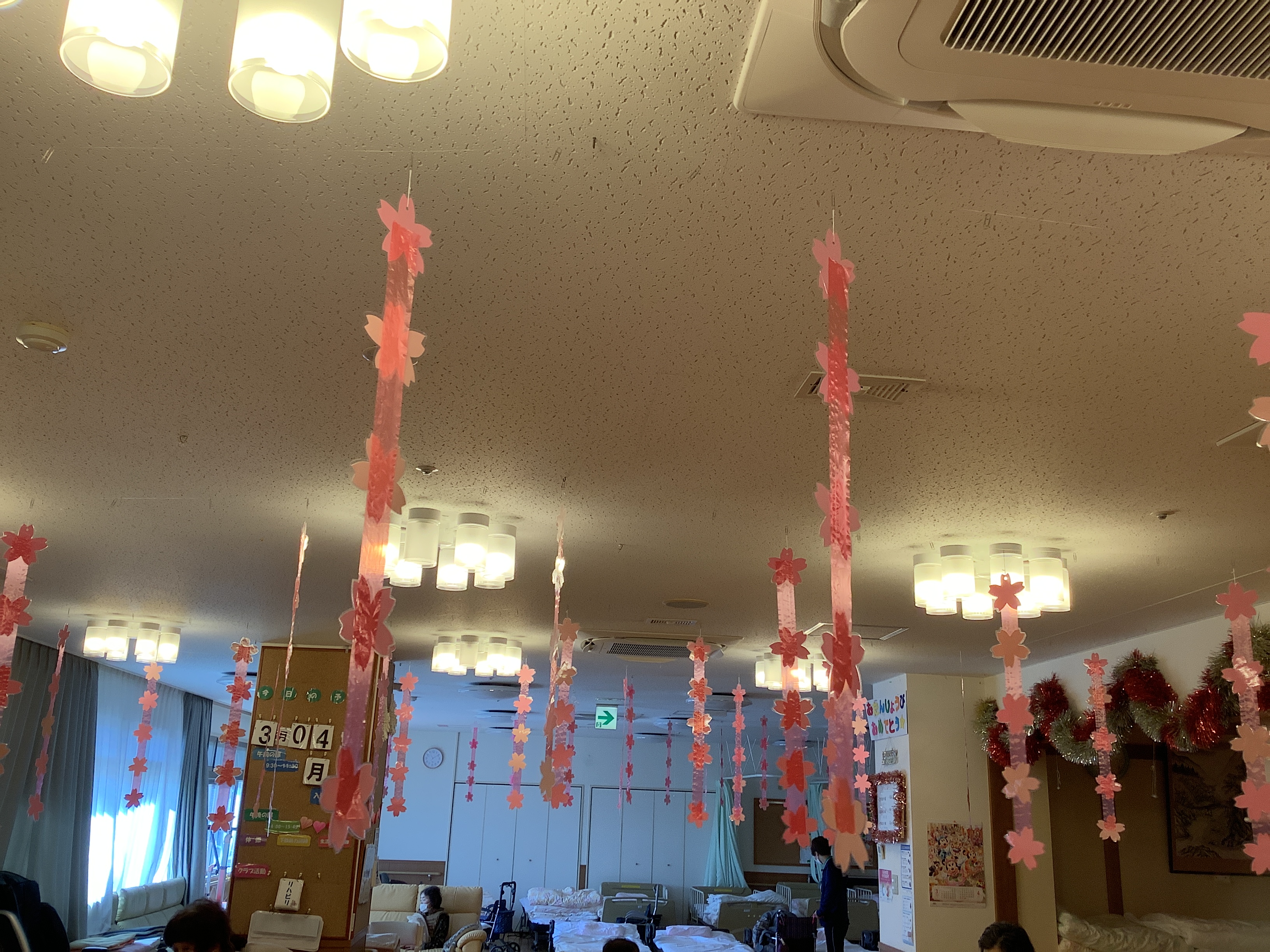 3月に入り暖かい日が多くなってきました。デイサービスの室内も一足早く桜や春の花が満開に咲いています(^^♪