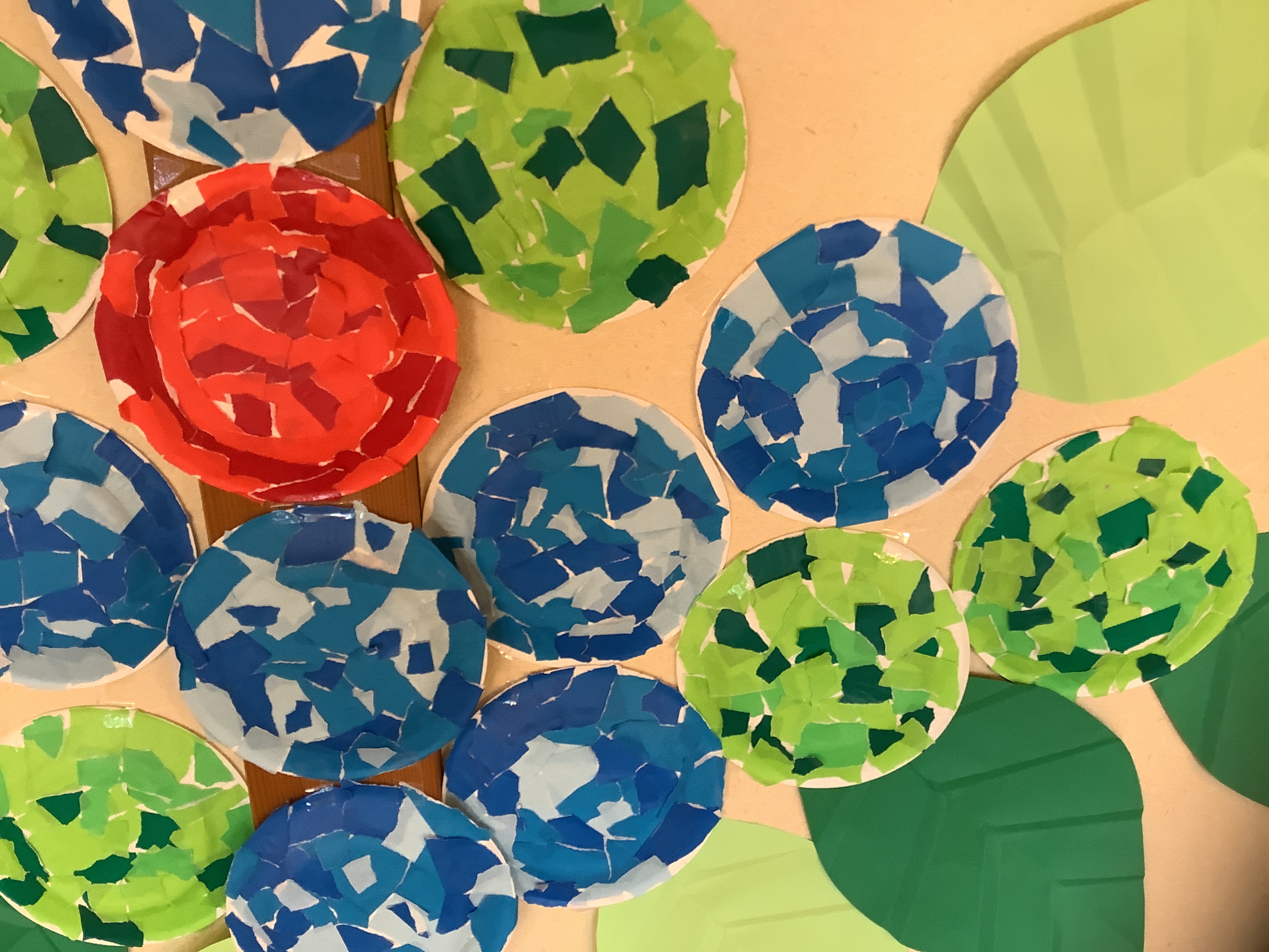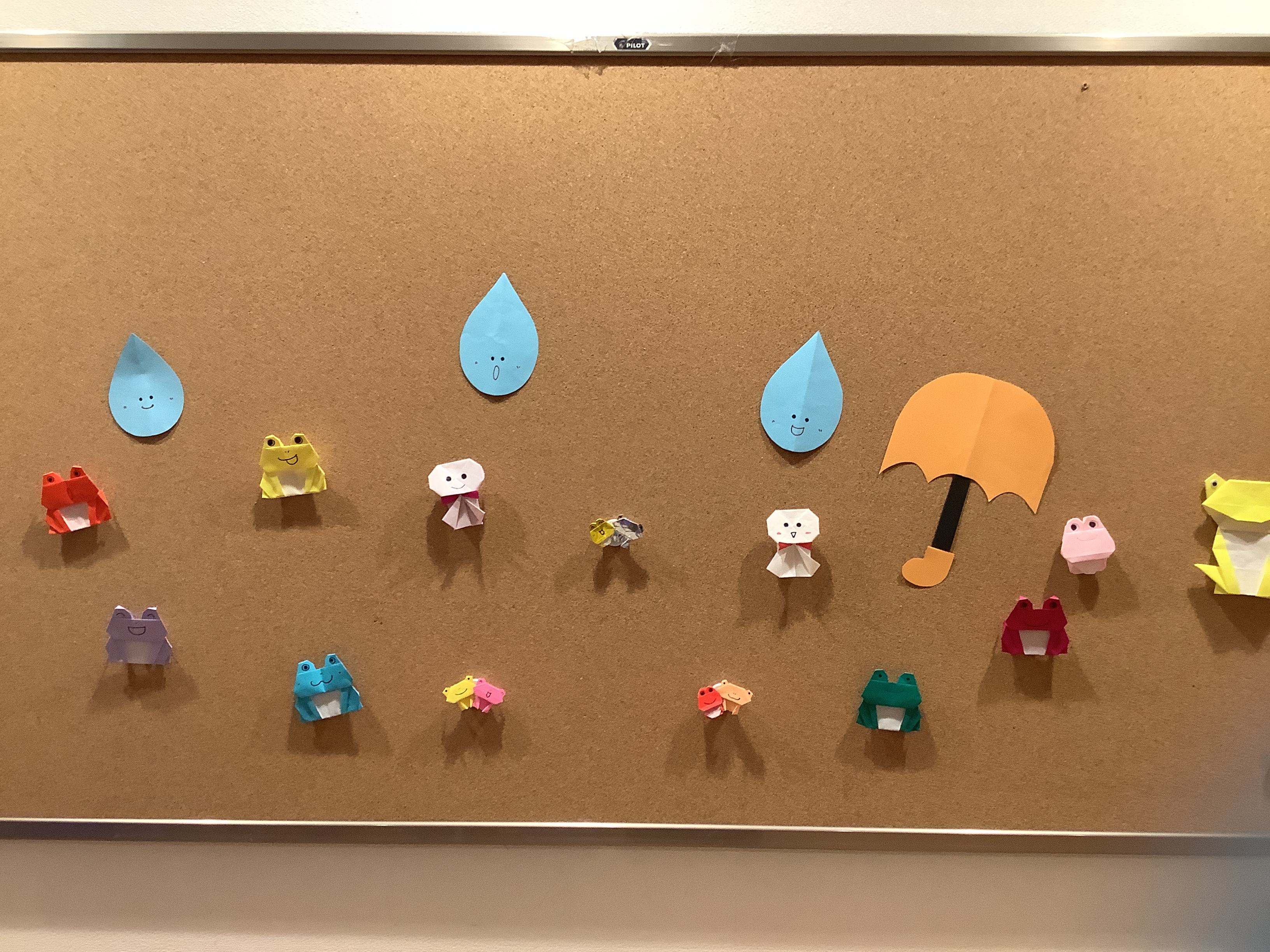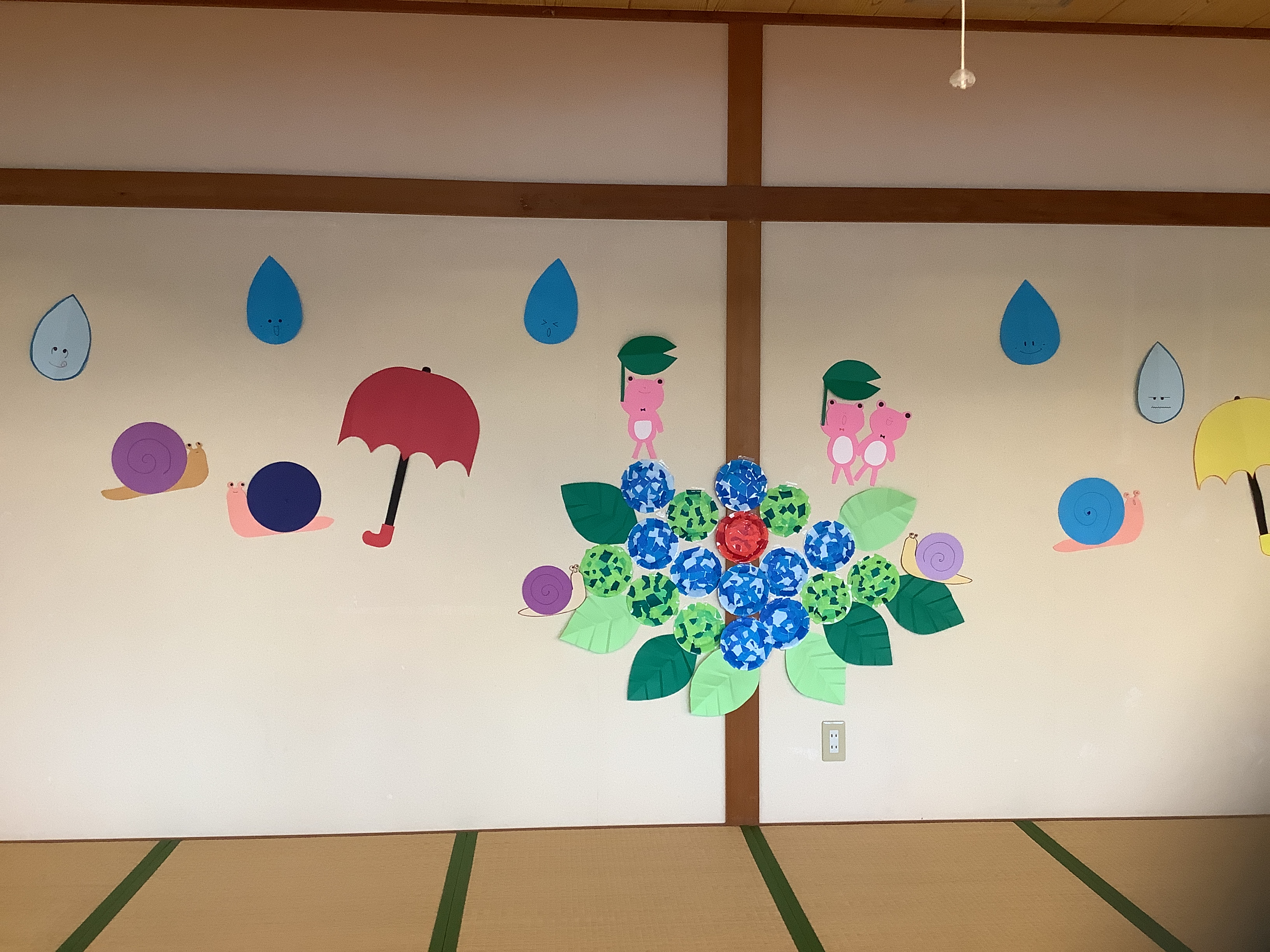 前回作っていた工作は紫陽花のお花でした!(^^)!紙皿と折り紙で作りました(^^♪ 壁飾りでも季節を感じて頂いています( *´艸`)