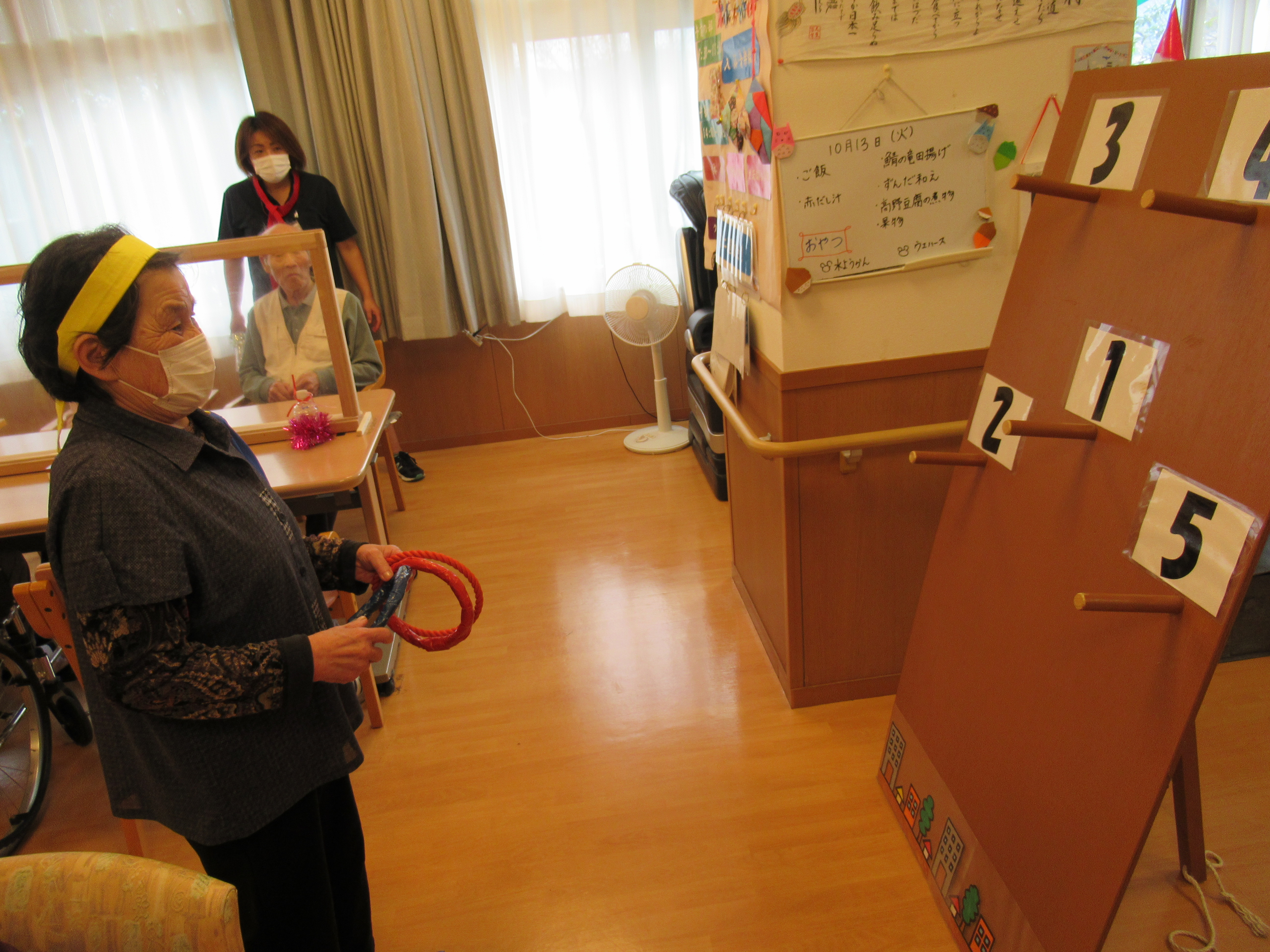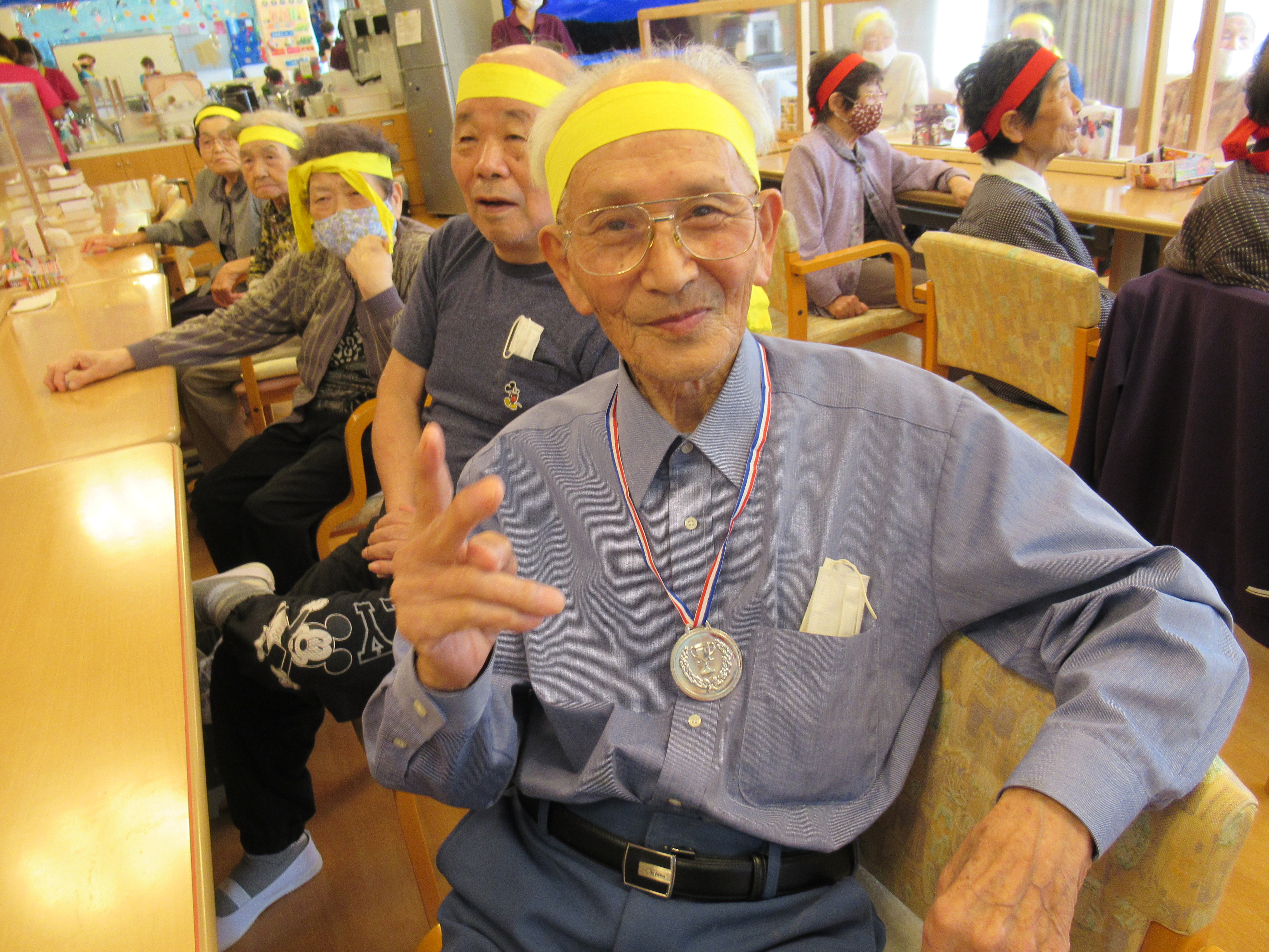 デイサービスでは、運動会週間とし今週は毎日ミニミニ運動会を行っていますヾ(≧▽≦)ノ 本日で前半が終わりました(#^.^#)残り3日間も全力で頑張ります☆ 感染症対策を行いながらですので、例年とは少し違った形で行っています。 「活躍賞の賞状」と「優秀賞のメダル」を狙い、毎日大盛り上がりしています(^^)!