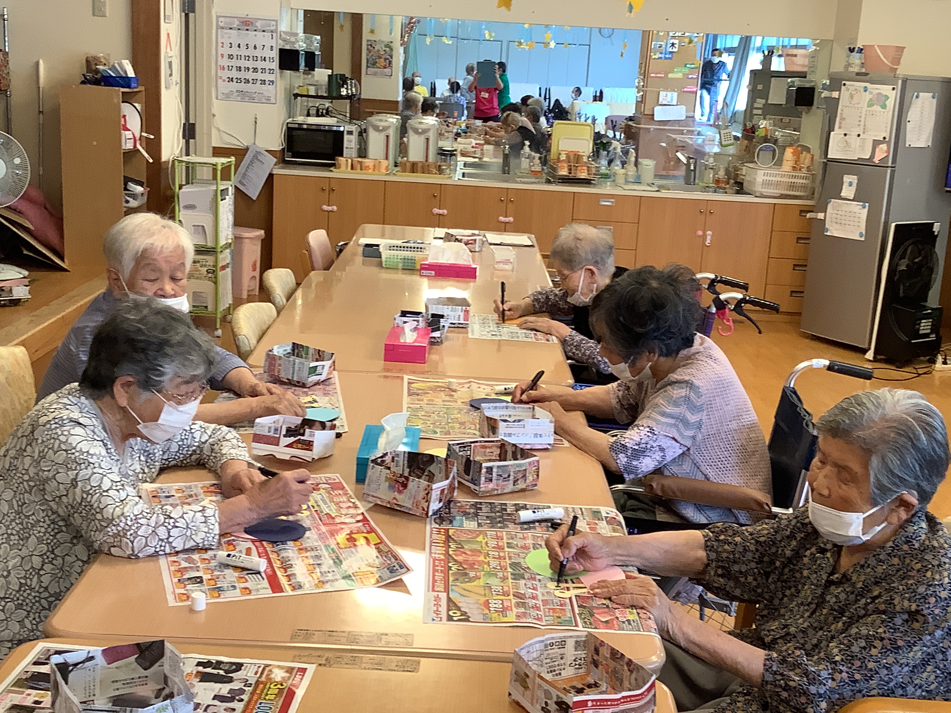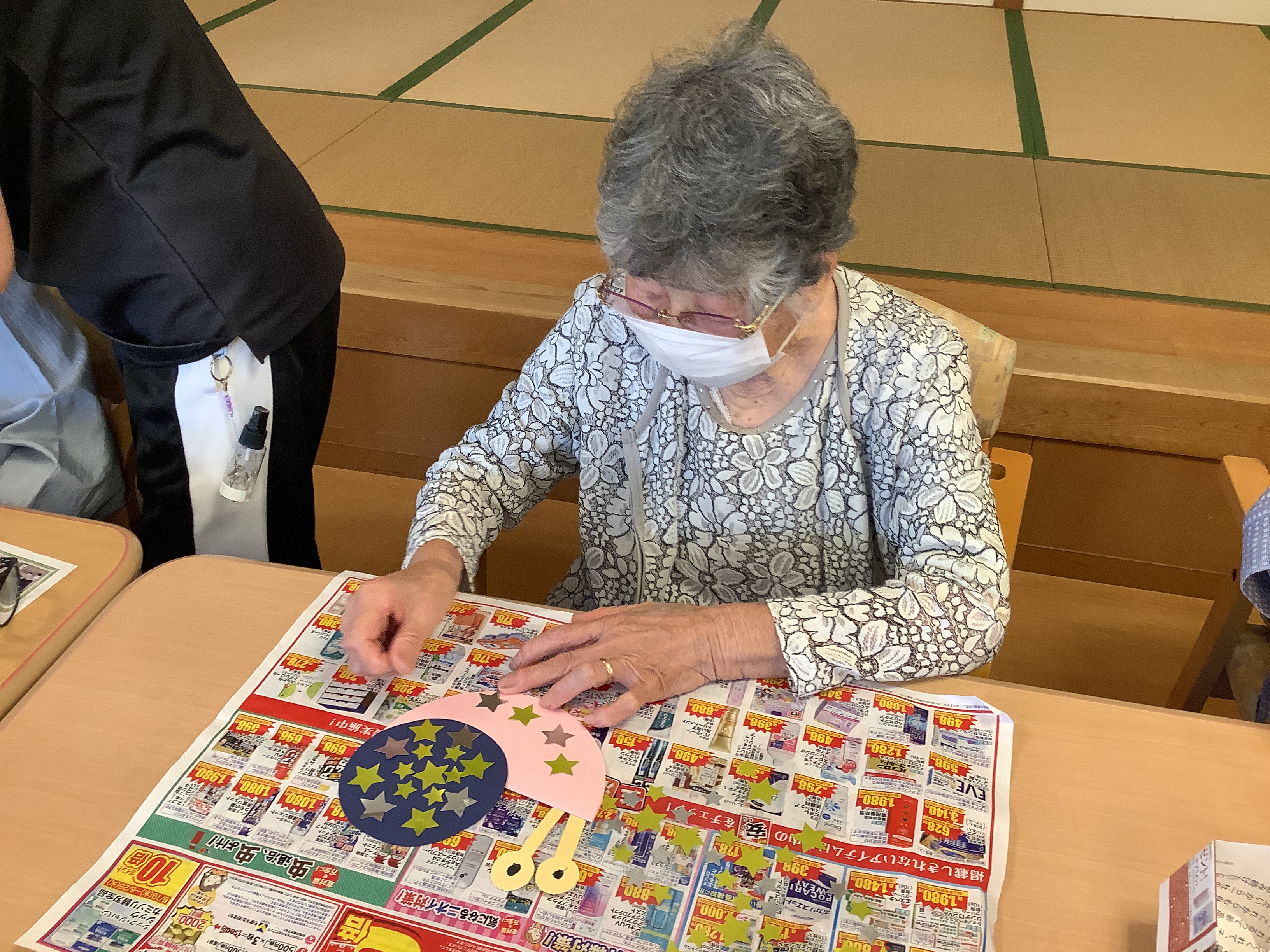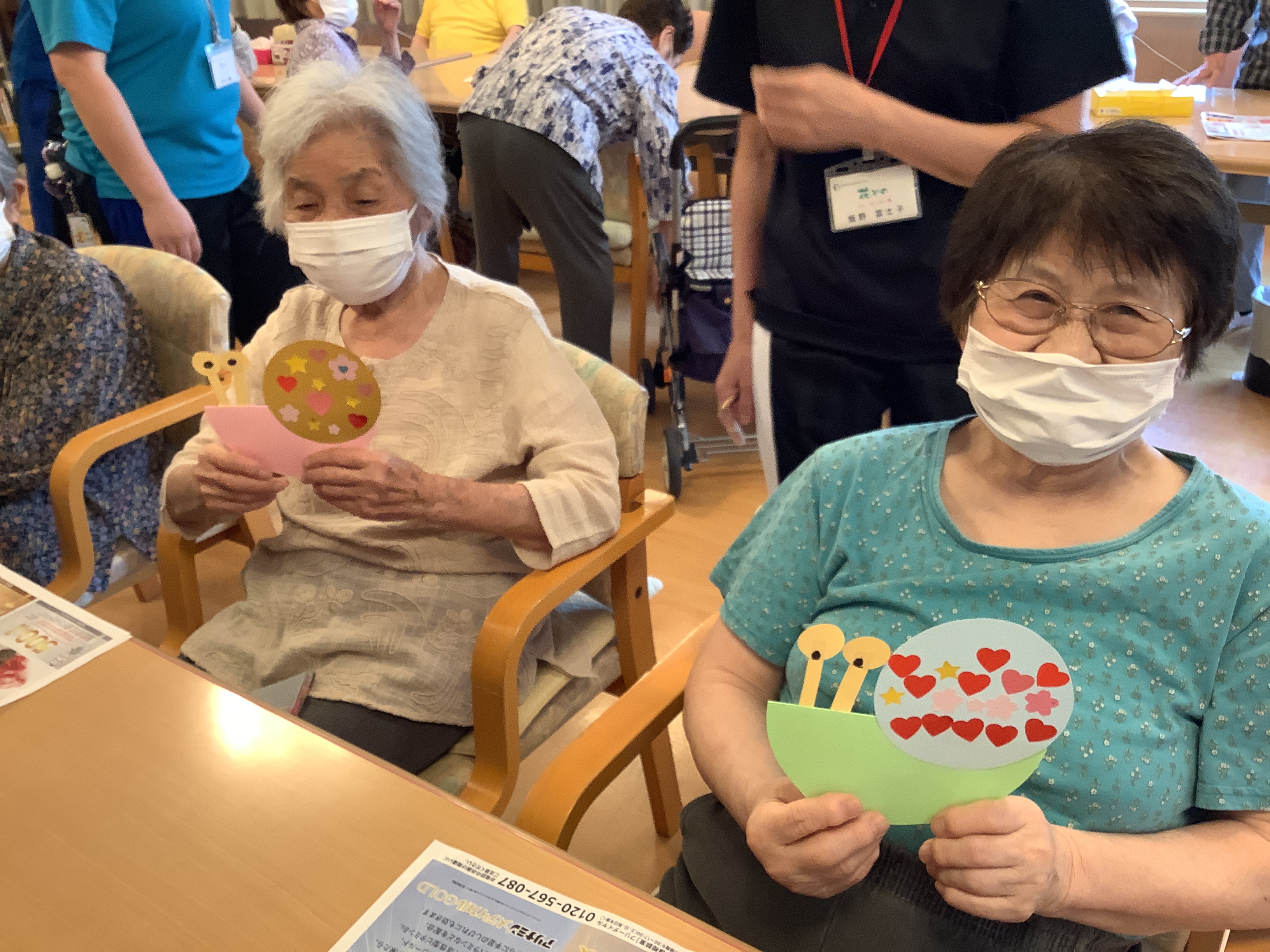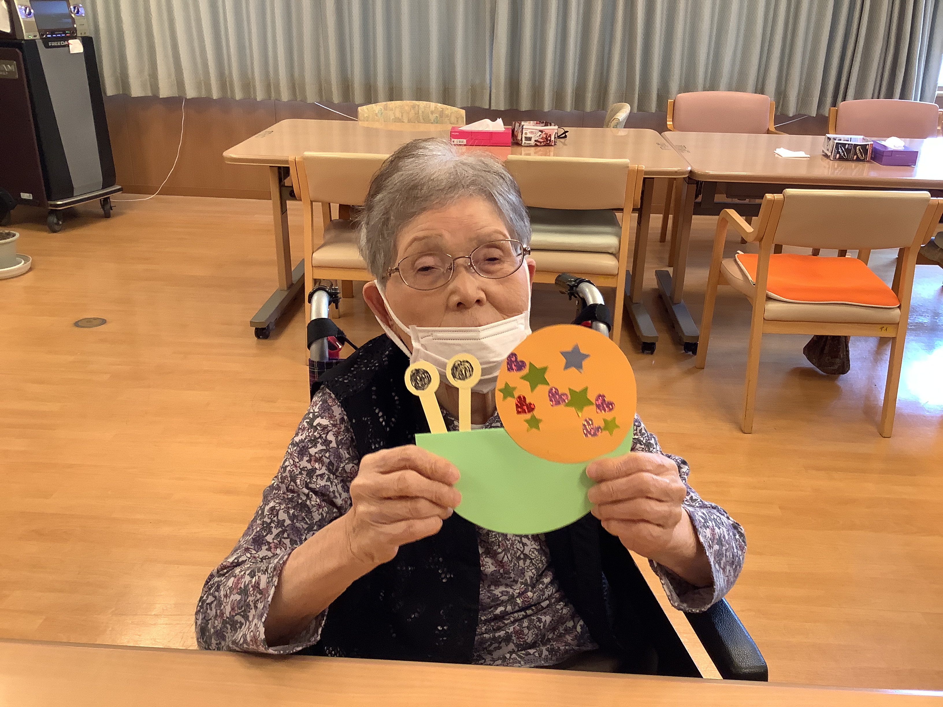 梅雨時期に入り、蒸し暑い日や雨の日が増えてきましたがデイサービスではぞの季節も楽しめるように季節に合った工作を行っています!(^^)!今回は、かたつむりを作りました♪シールを貼りながら楽しまれていました( *´艸`)