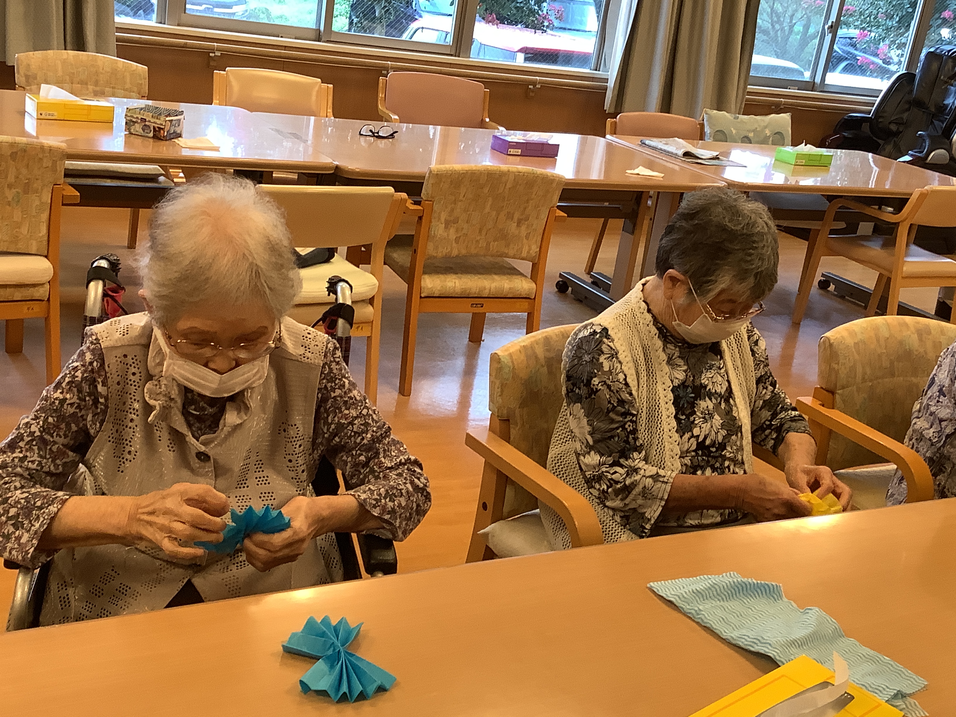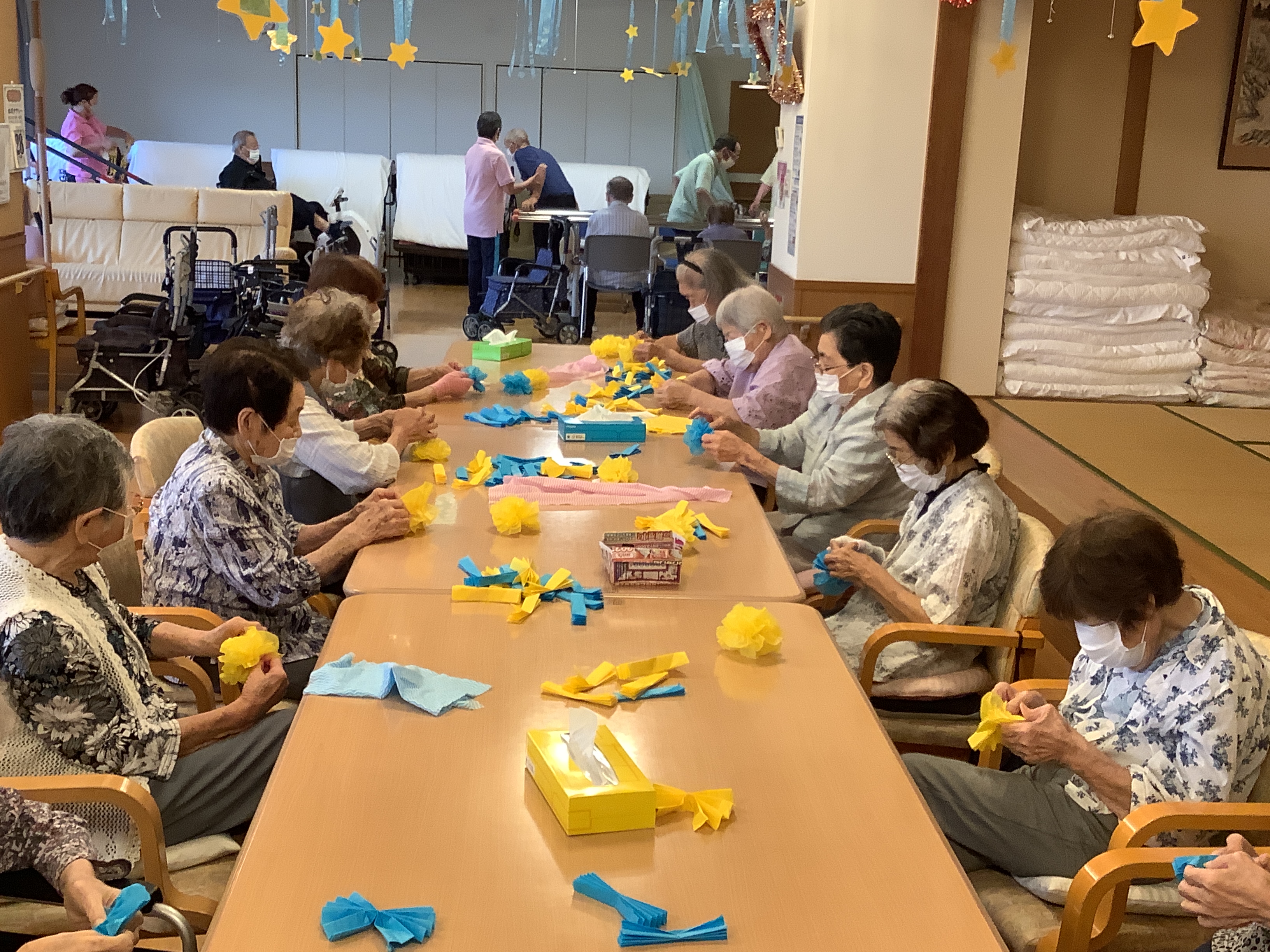 お花作りは利用者様に人気のようで、皆様真剣に取り組まれています(*^^*)昔婦人会でやったわ♪と会話も盛り上がっていました(^^♪