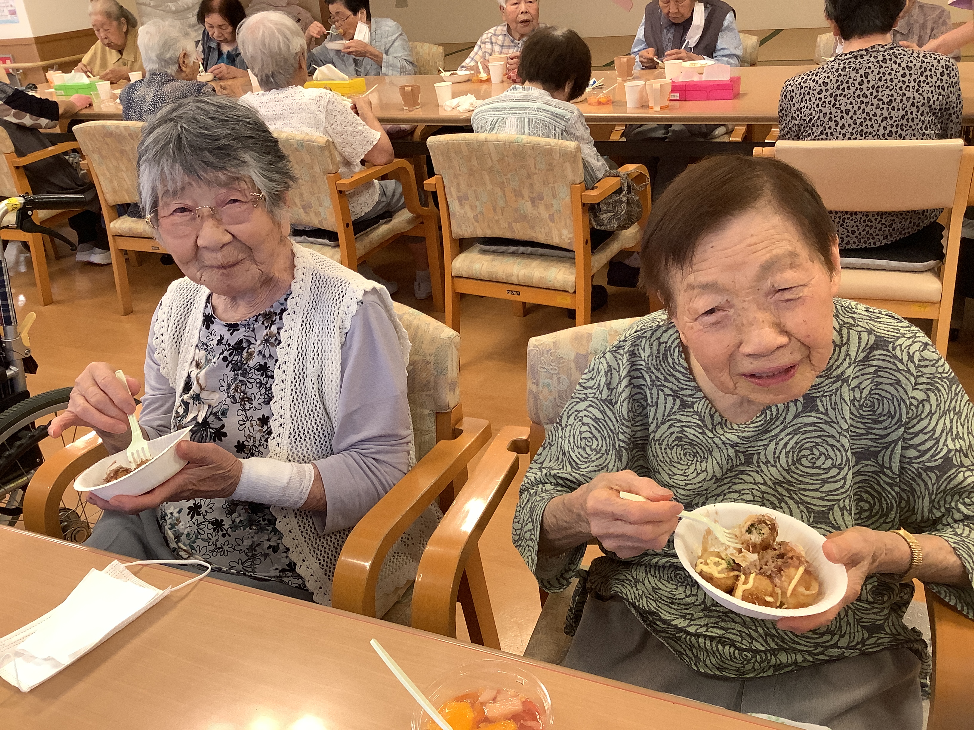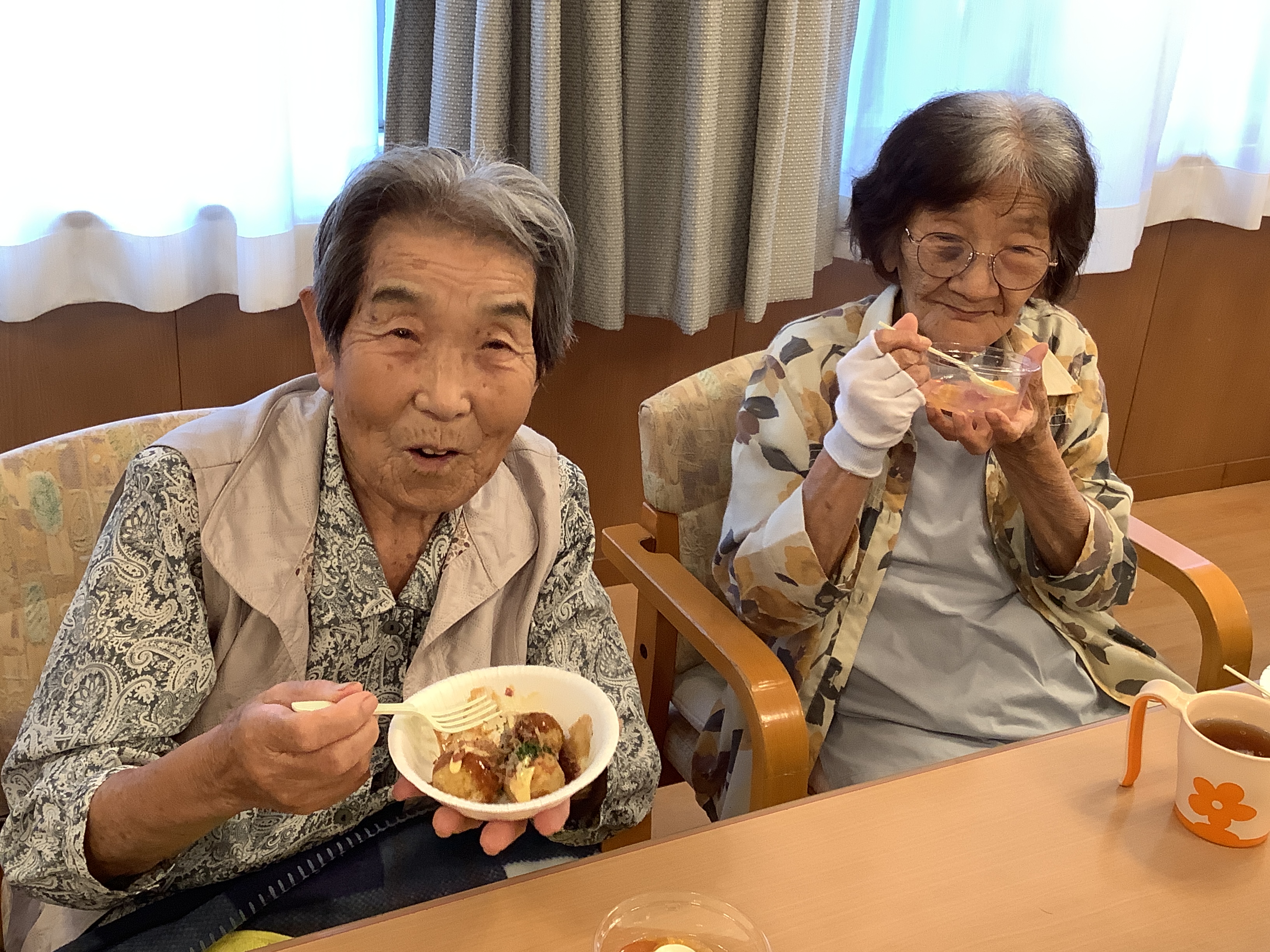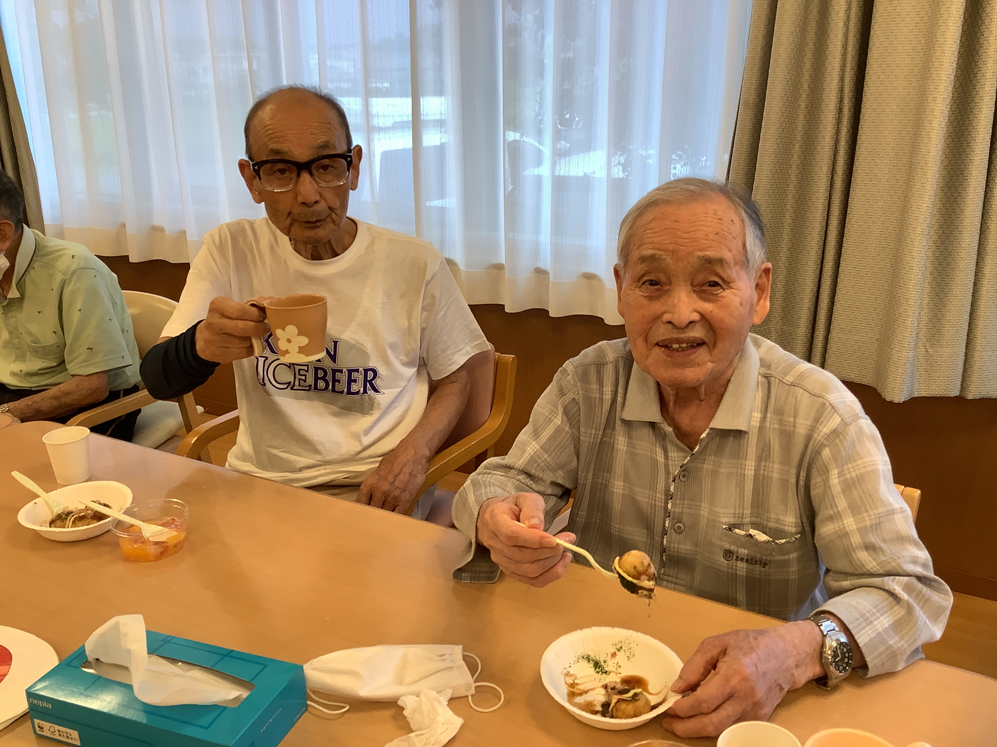 最後におやつは美味しいたこ焼きとフルーツポンチに飲み物レクでお好きな飲み物を召し上がって頂きました!(^^)! 男性利用者様にはノンアルコールビールが人気でした(*´▽`*) 皆様、笑顔で帰宅されました(*´▽`*)