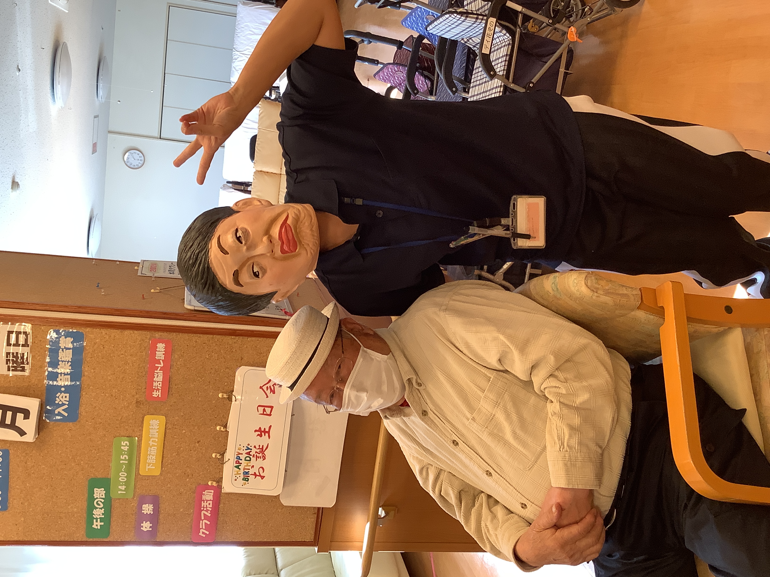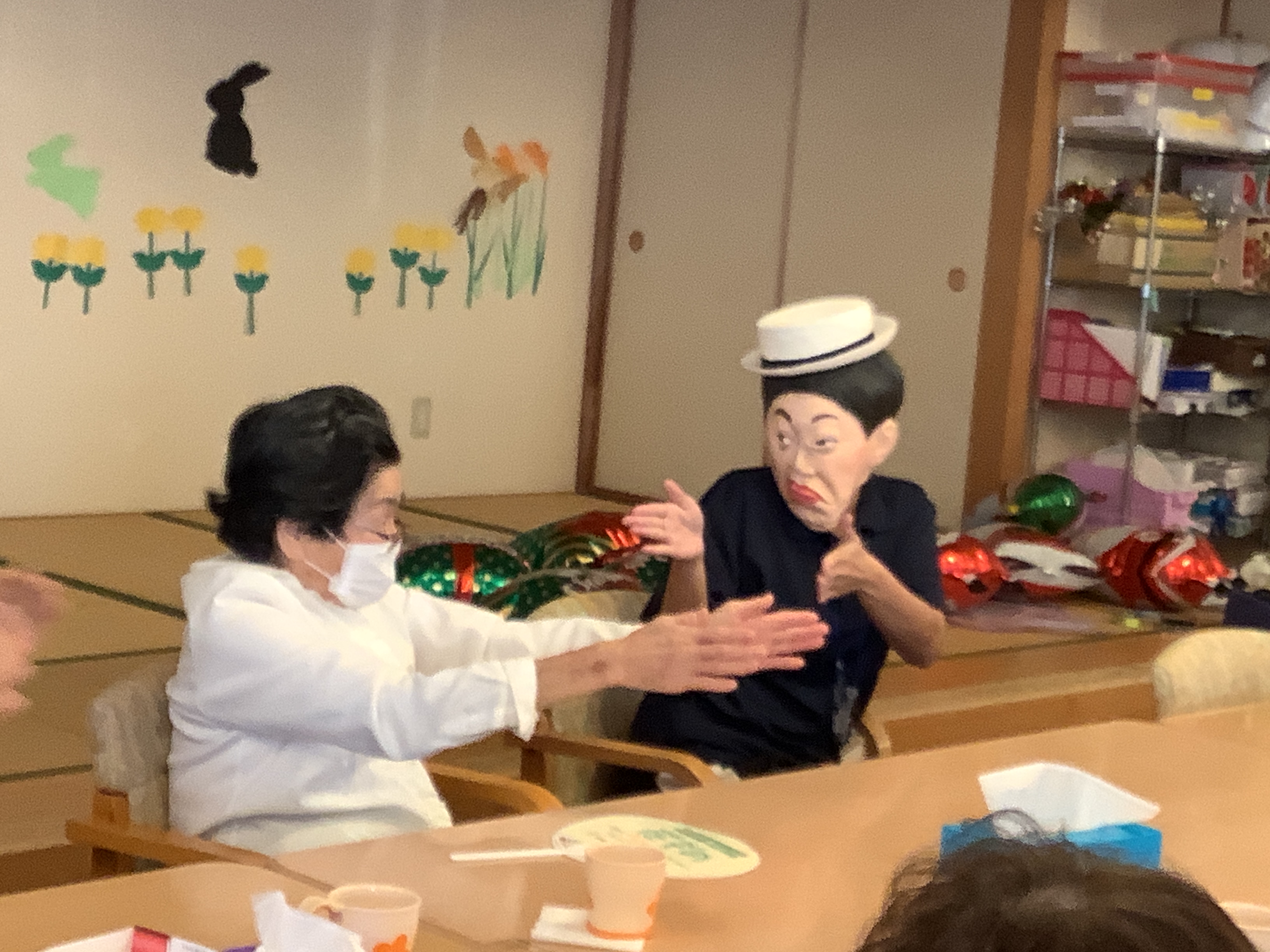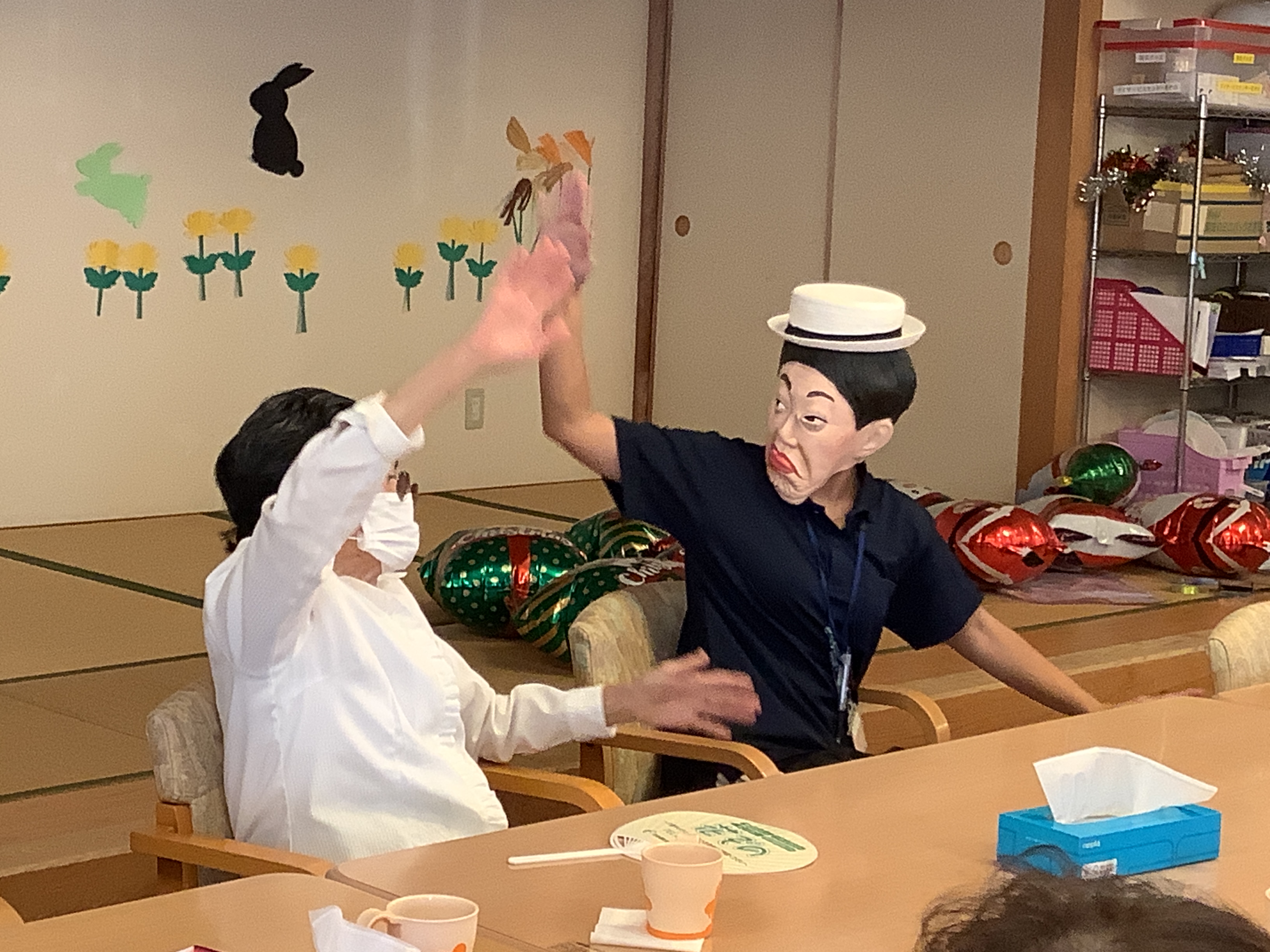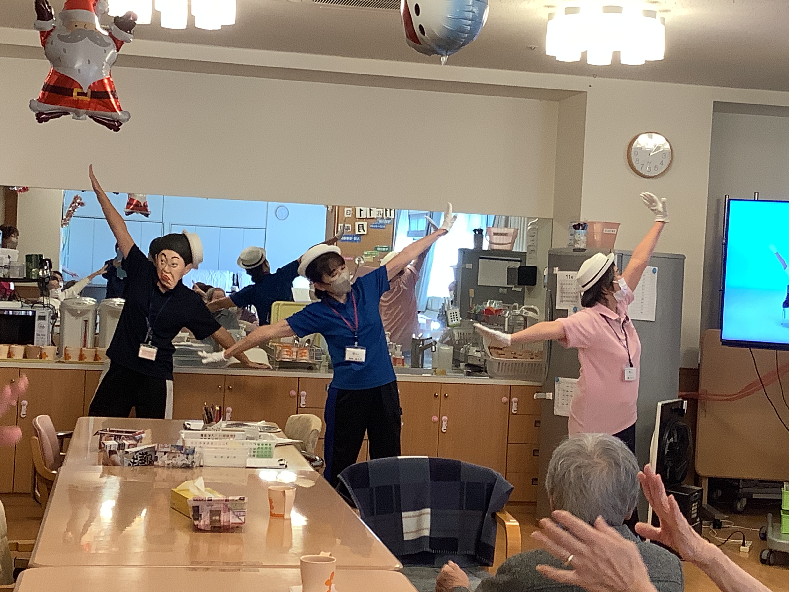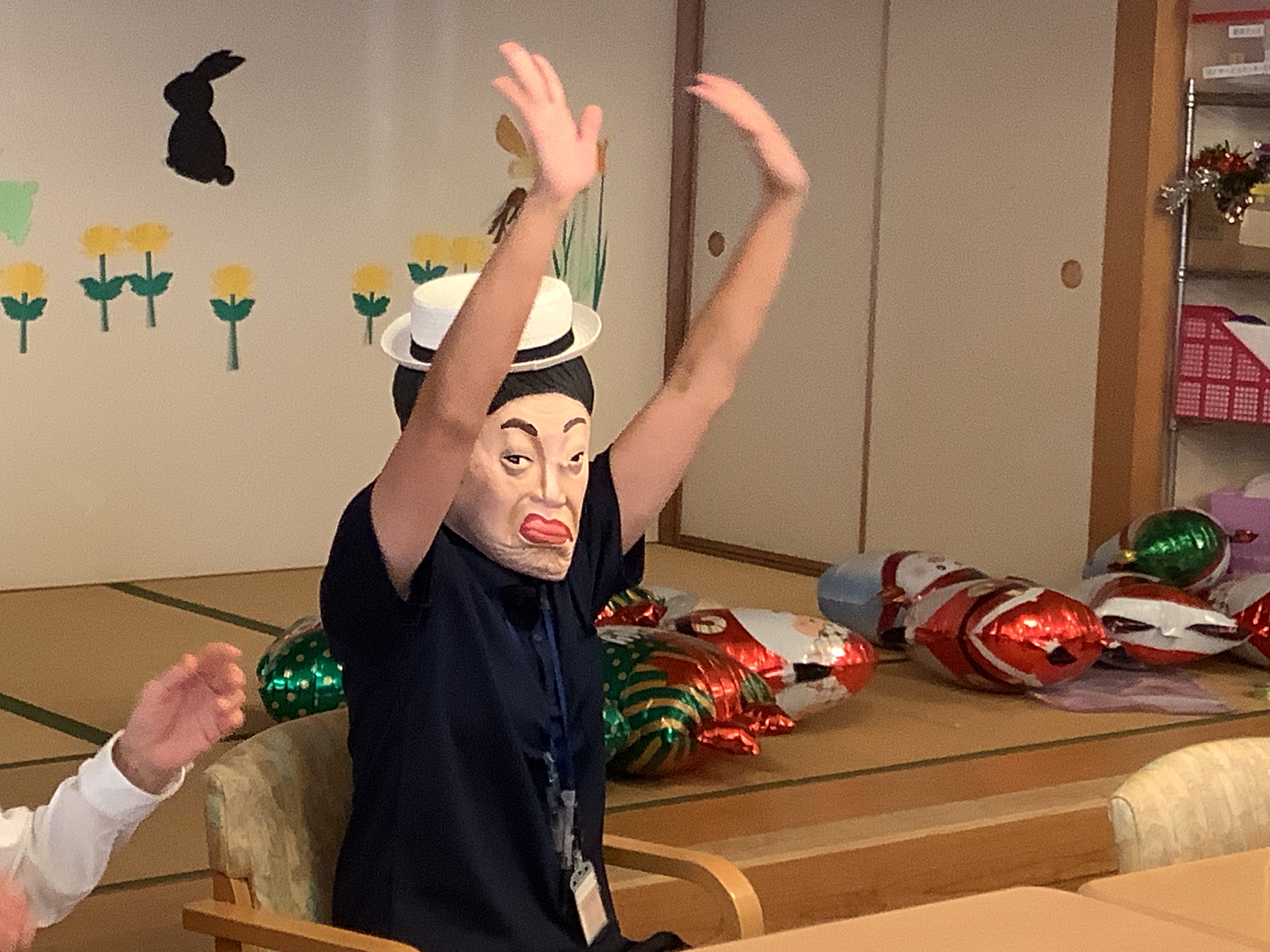 利用者様と職員が楽しく午後の体操をしていたら。。。突然、美川様が現れました('Д') 利用者様達も、大笑い(^^)/ 顔の体操も出来て良かったですね♪