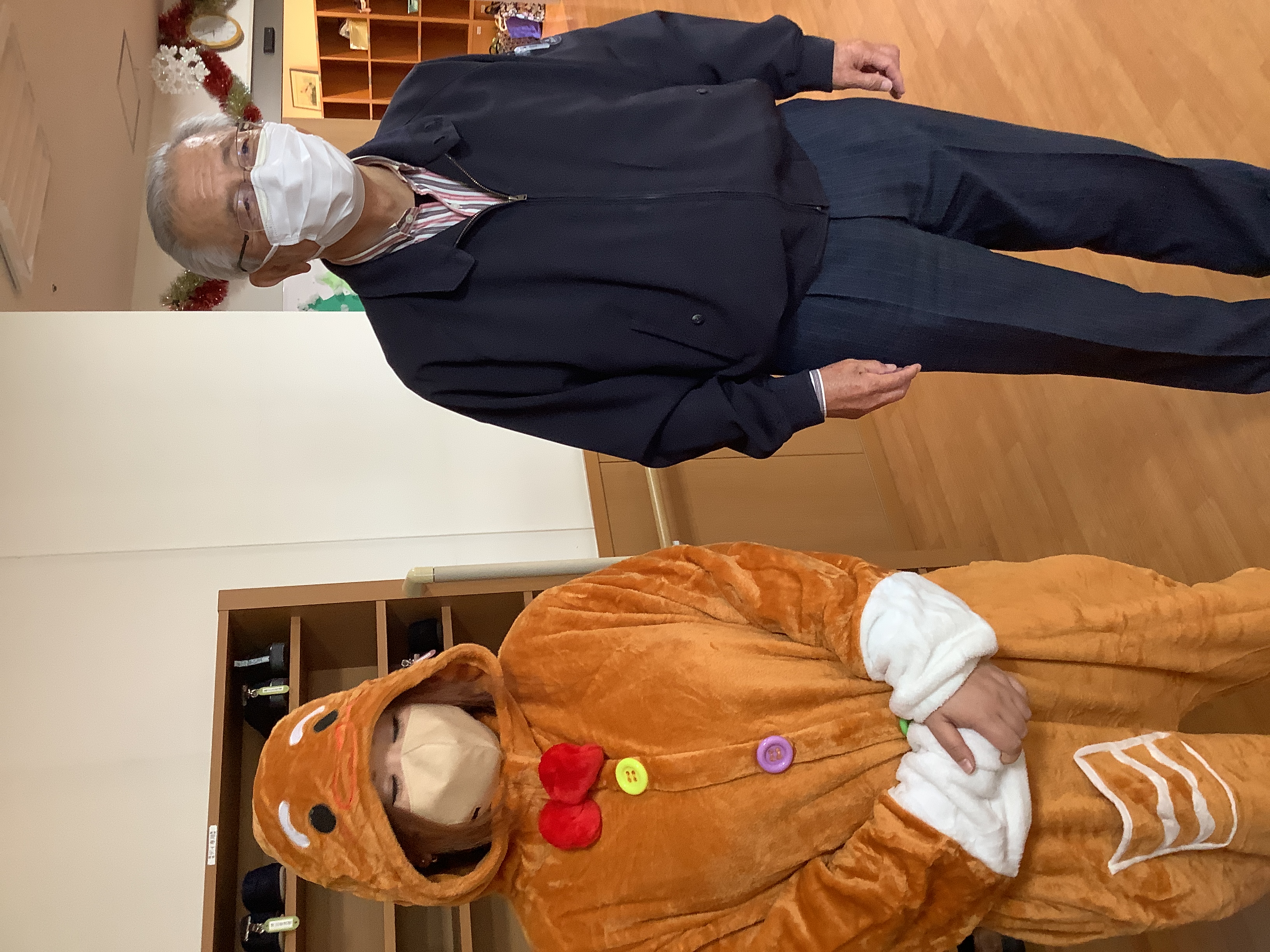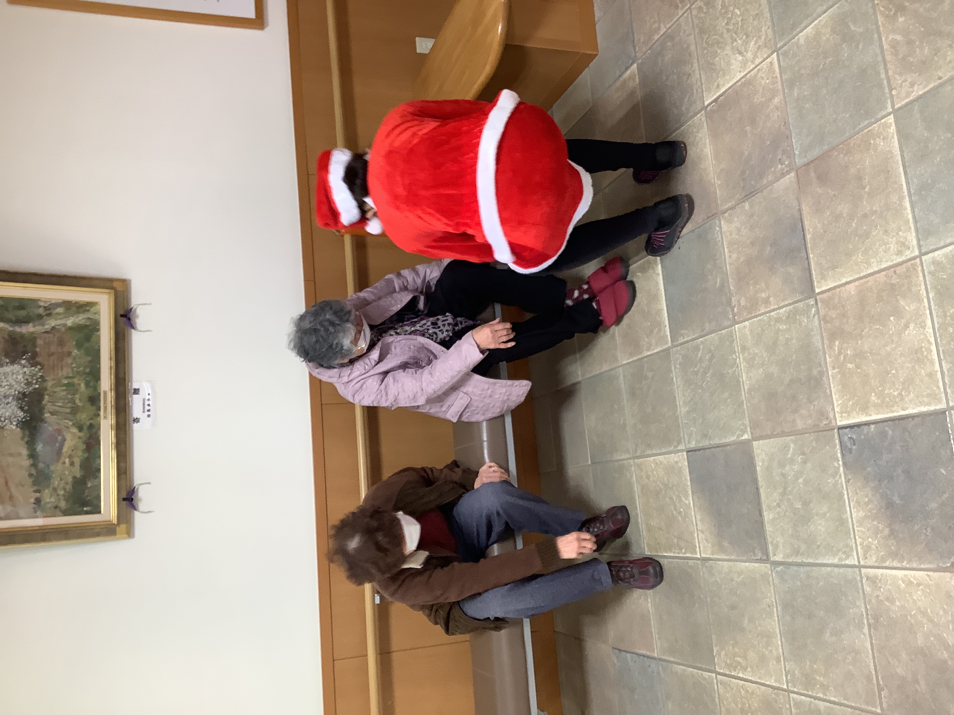 今年のクリスマス会は、朝からクリスマスコスチュームを身に着けた職員がお出迎え(⌒∇⌒)
