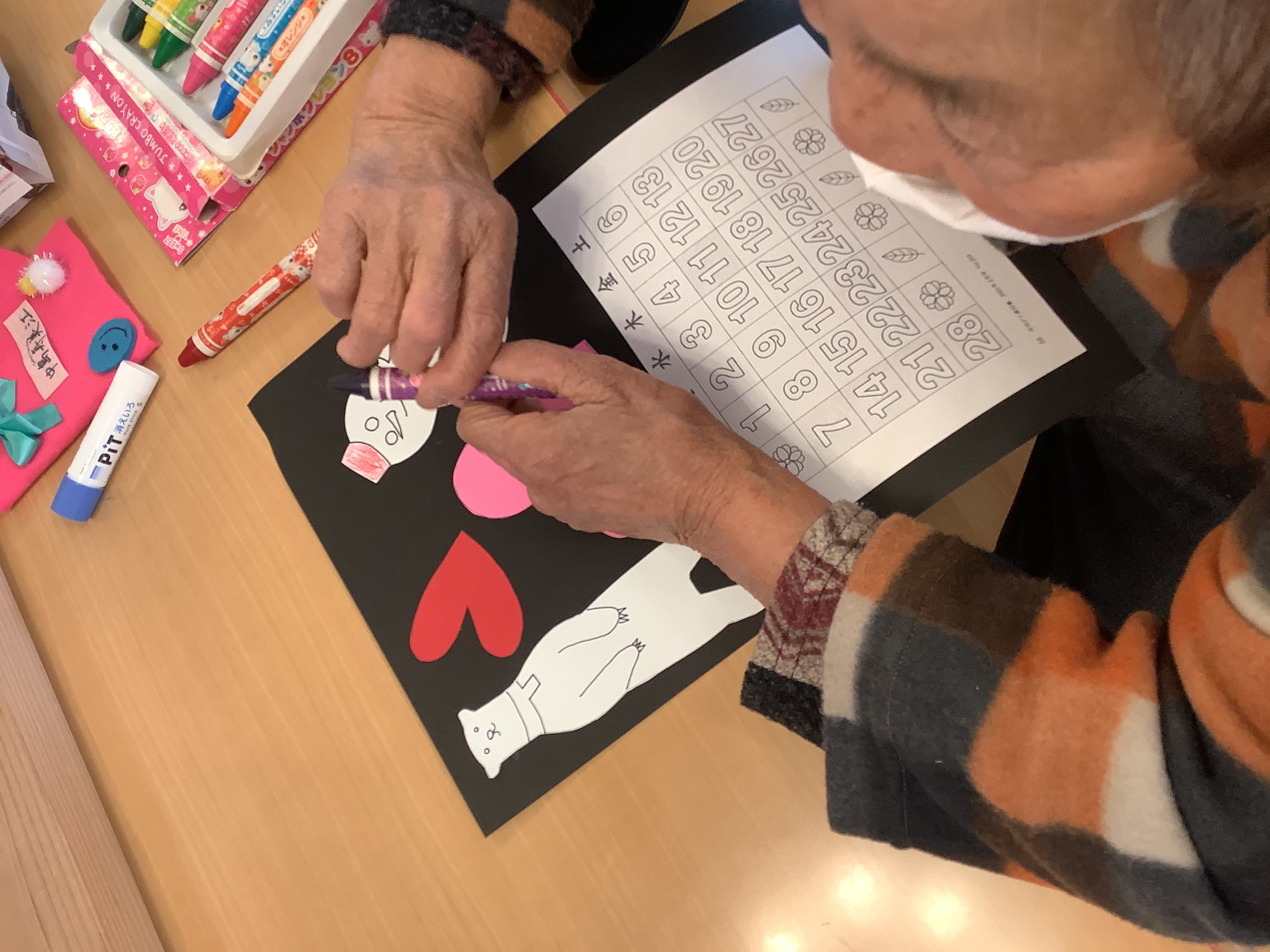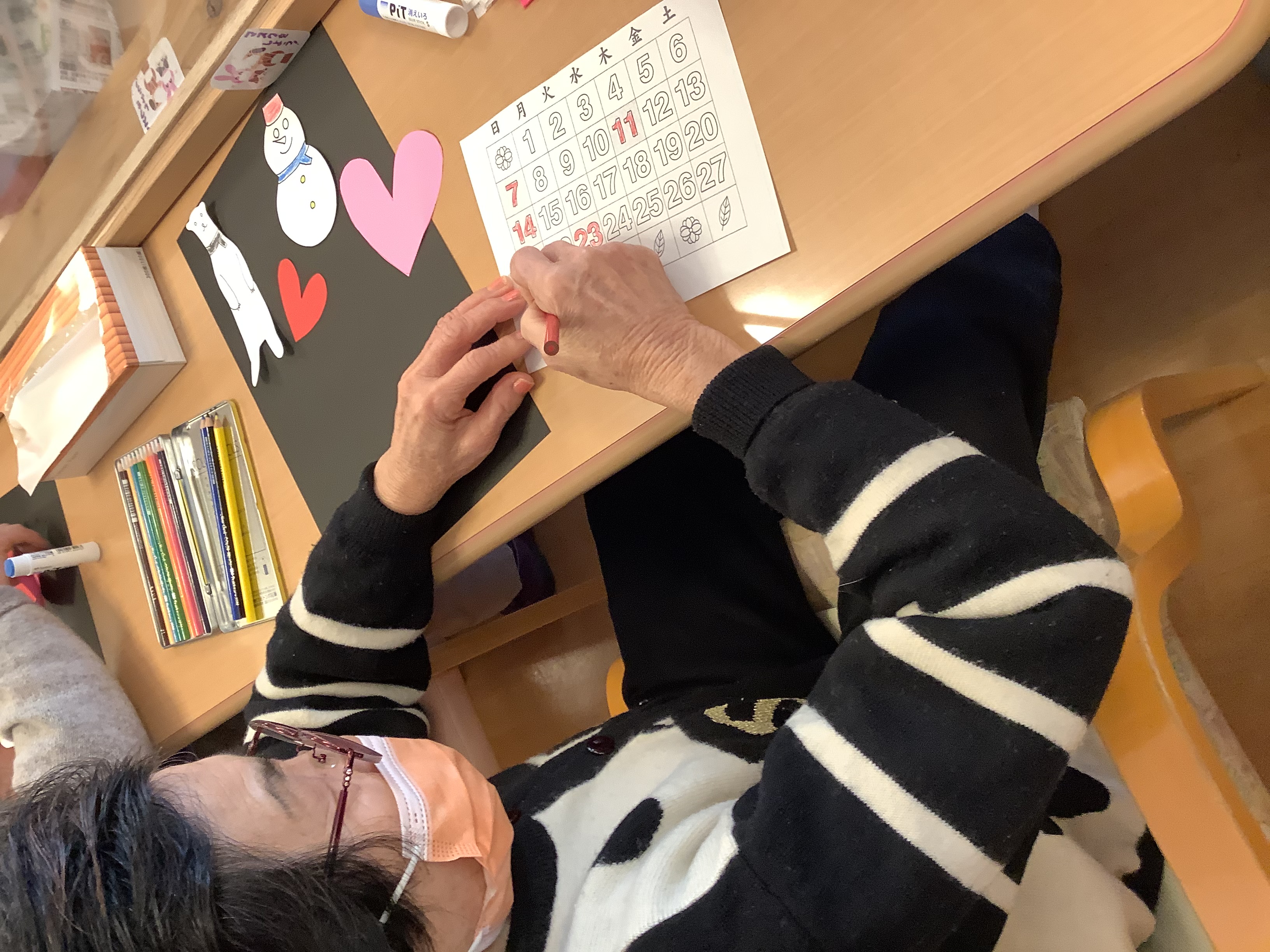 2月のカレンダー作りを行いました(^^♪ バレンタインを意識し可愛いハートも飾ってみました♡皆様、嬉しそうに自宅に持ち帰っていました(*'▽')