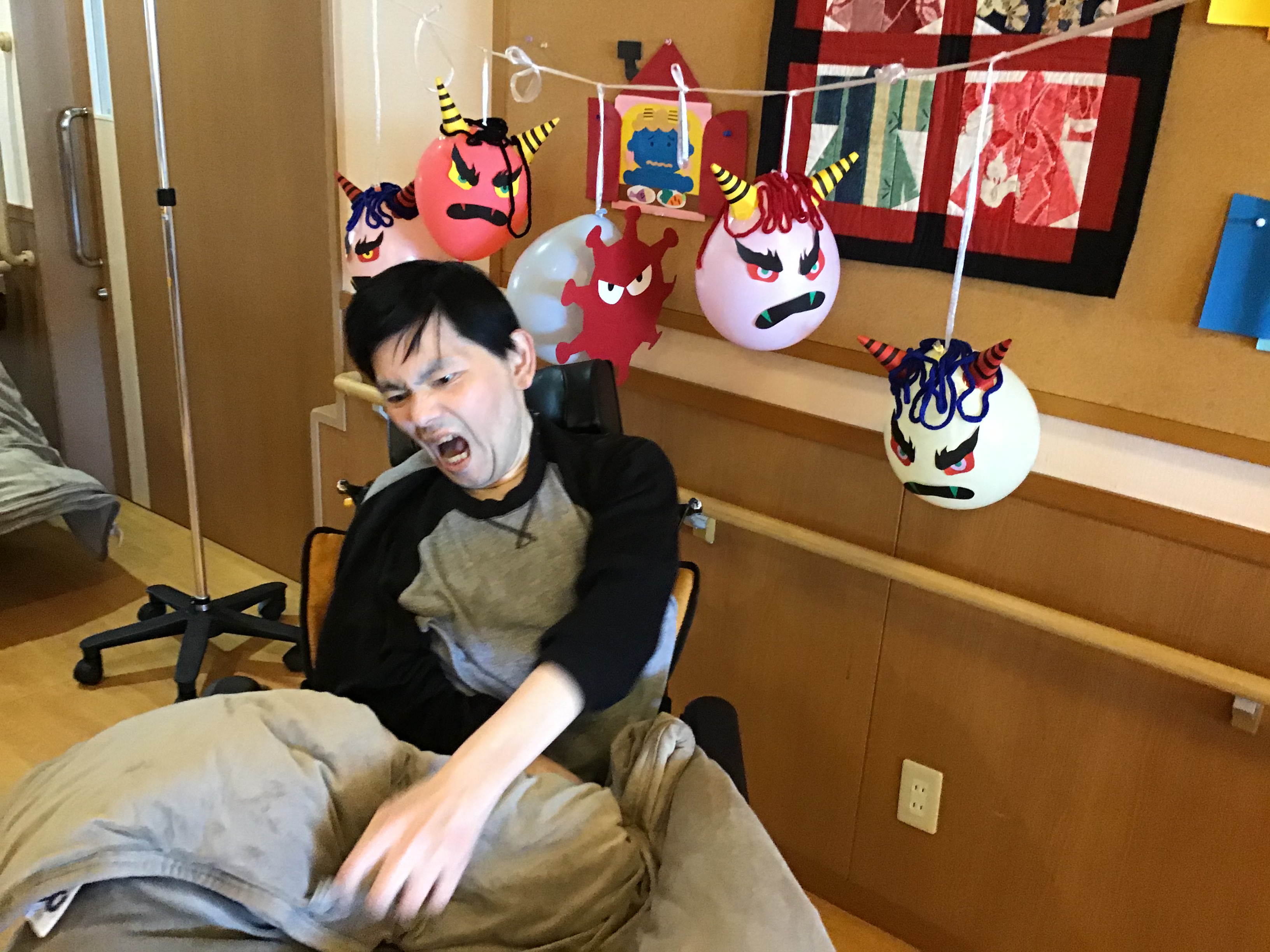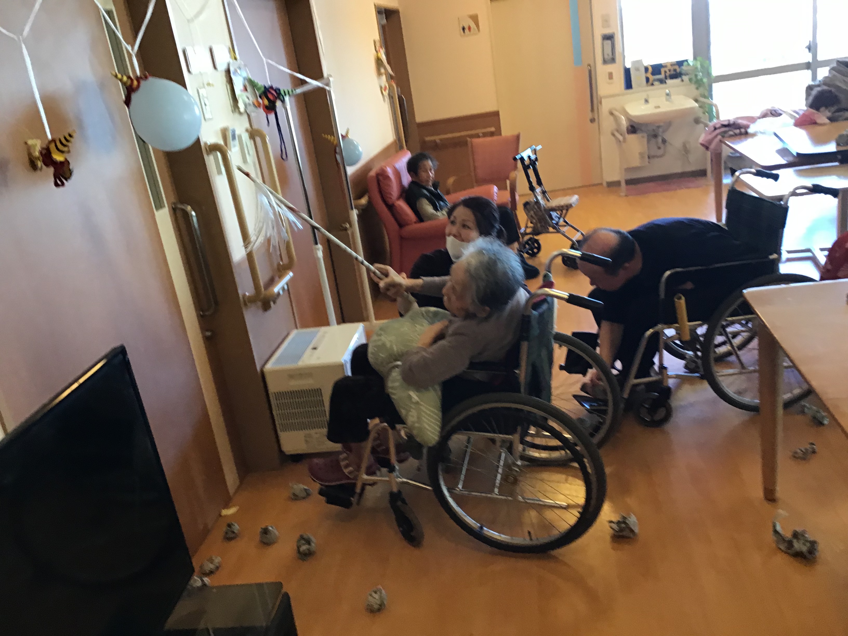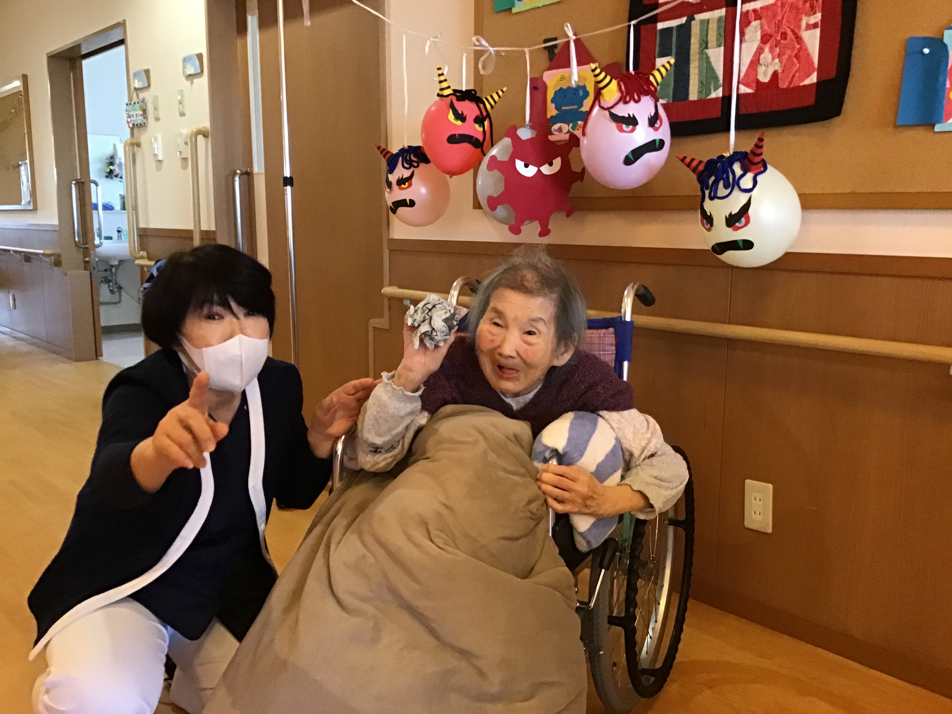 今年はコロナ過の中、規模を縮小しての節分豆まきを行いました。職員の手作り風船鬼とコロナウイルスに向かって「鬼は―外!」「福は―内!」と皆さん一生懸命、新聞玉を投げていました。最後に、槍で鬼とウイルスを撃退していました。