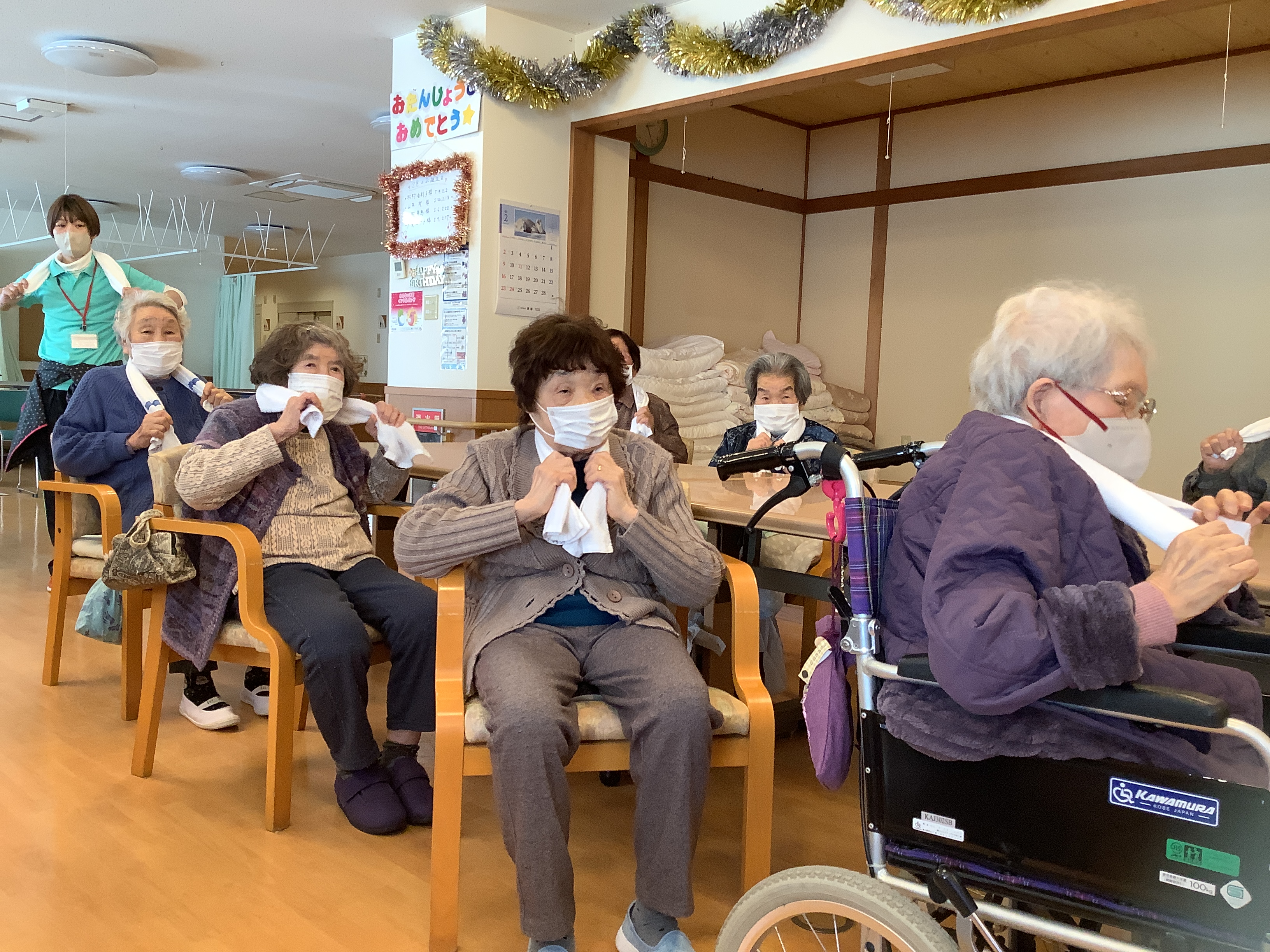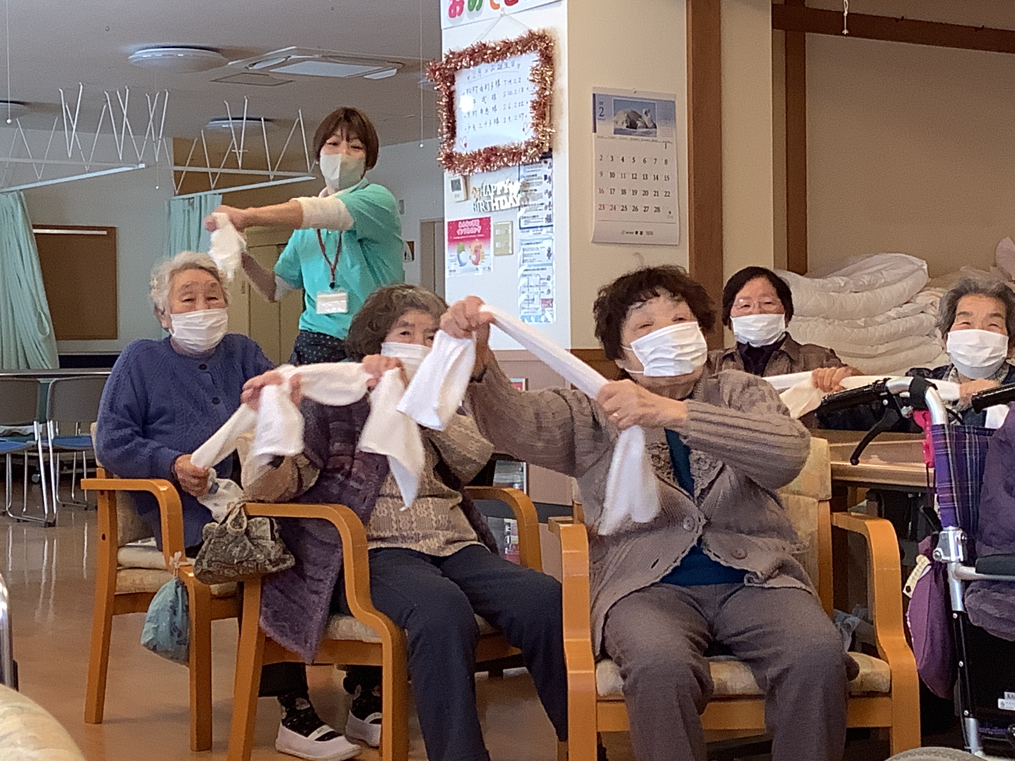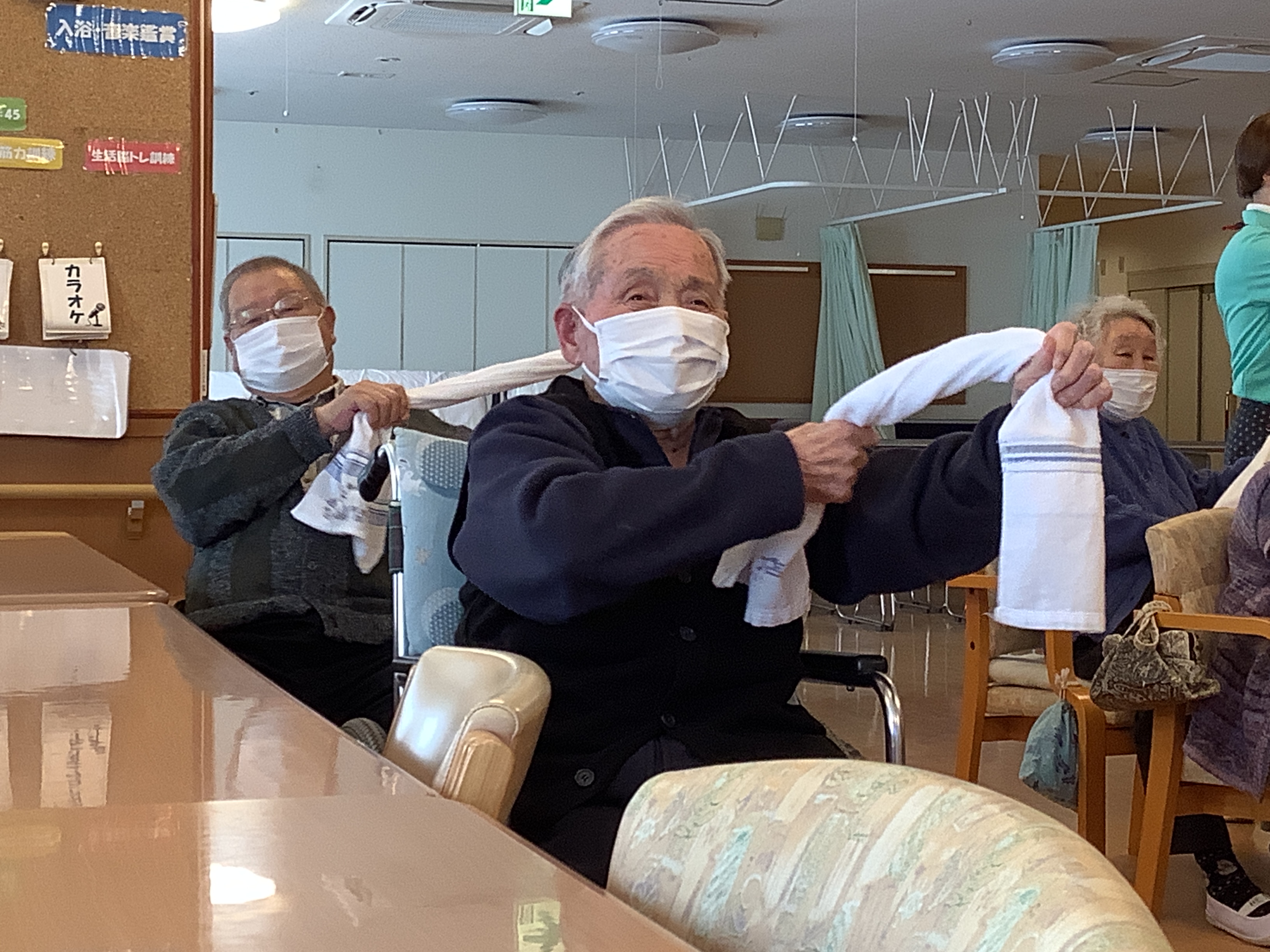 タオルを使った体操も人気のリハビリです。腕を無理なく動かせるため利用者様への負担も少なく取り組めます!(^^)! 中には昔を思い出して、首元や頭に巻いてみる方もいらっしゃいます♪