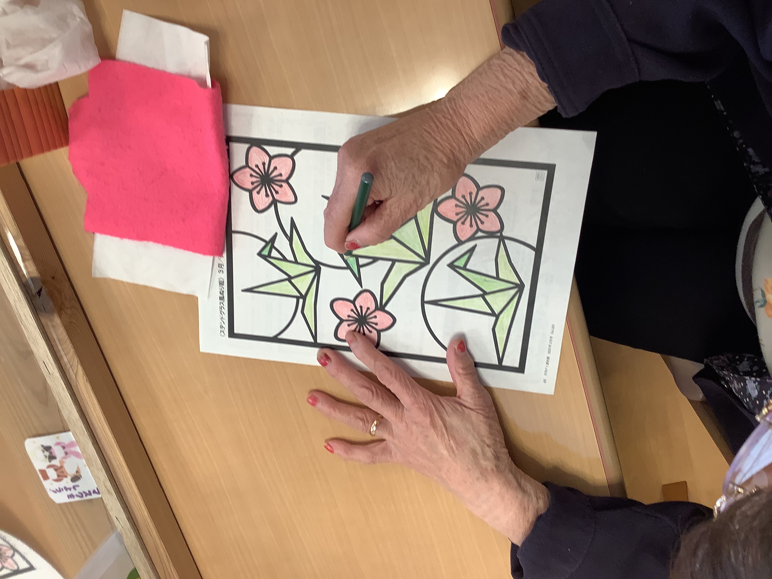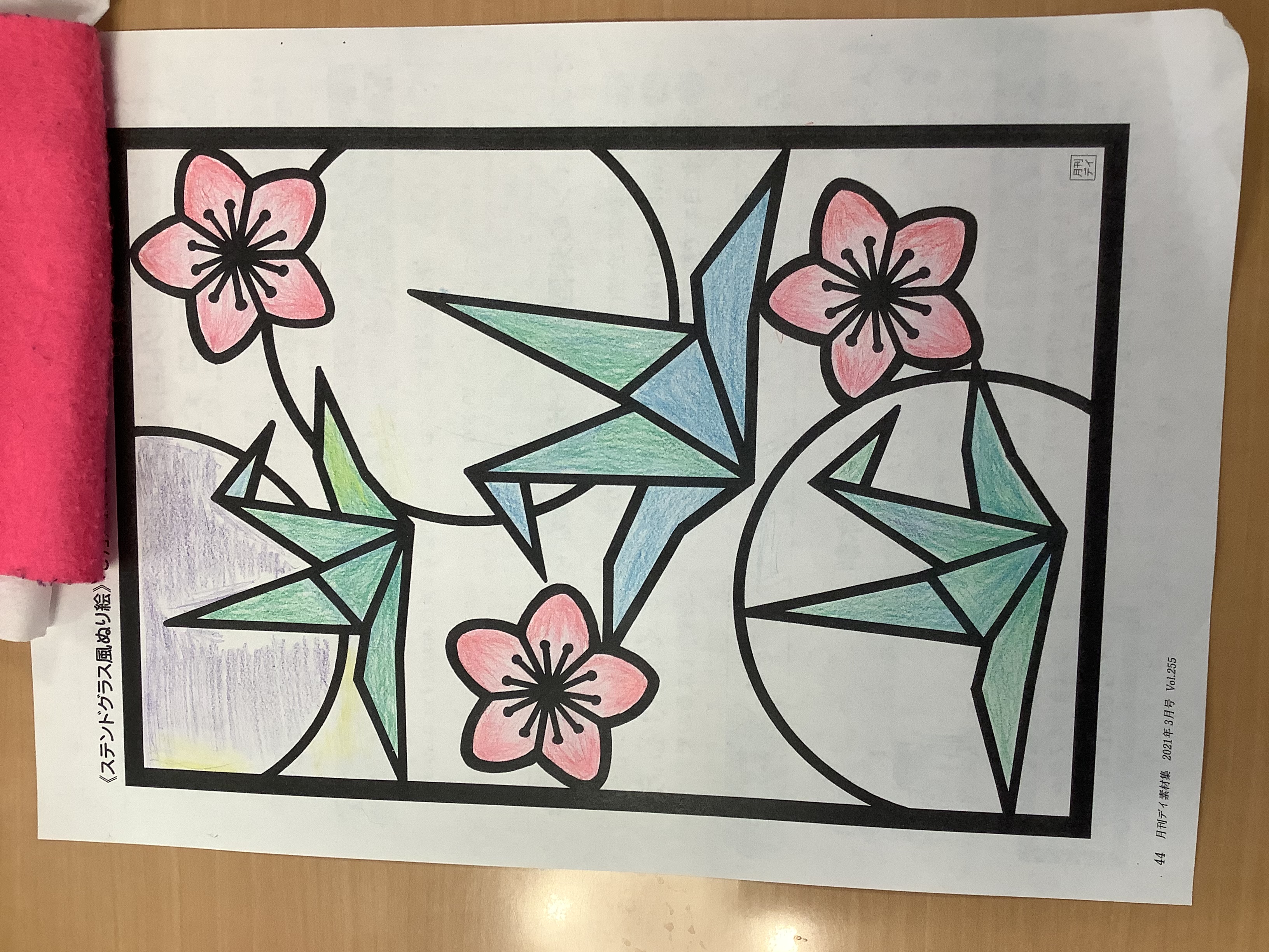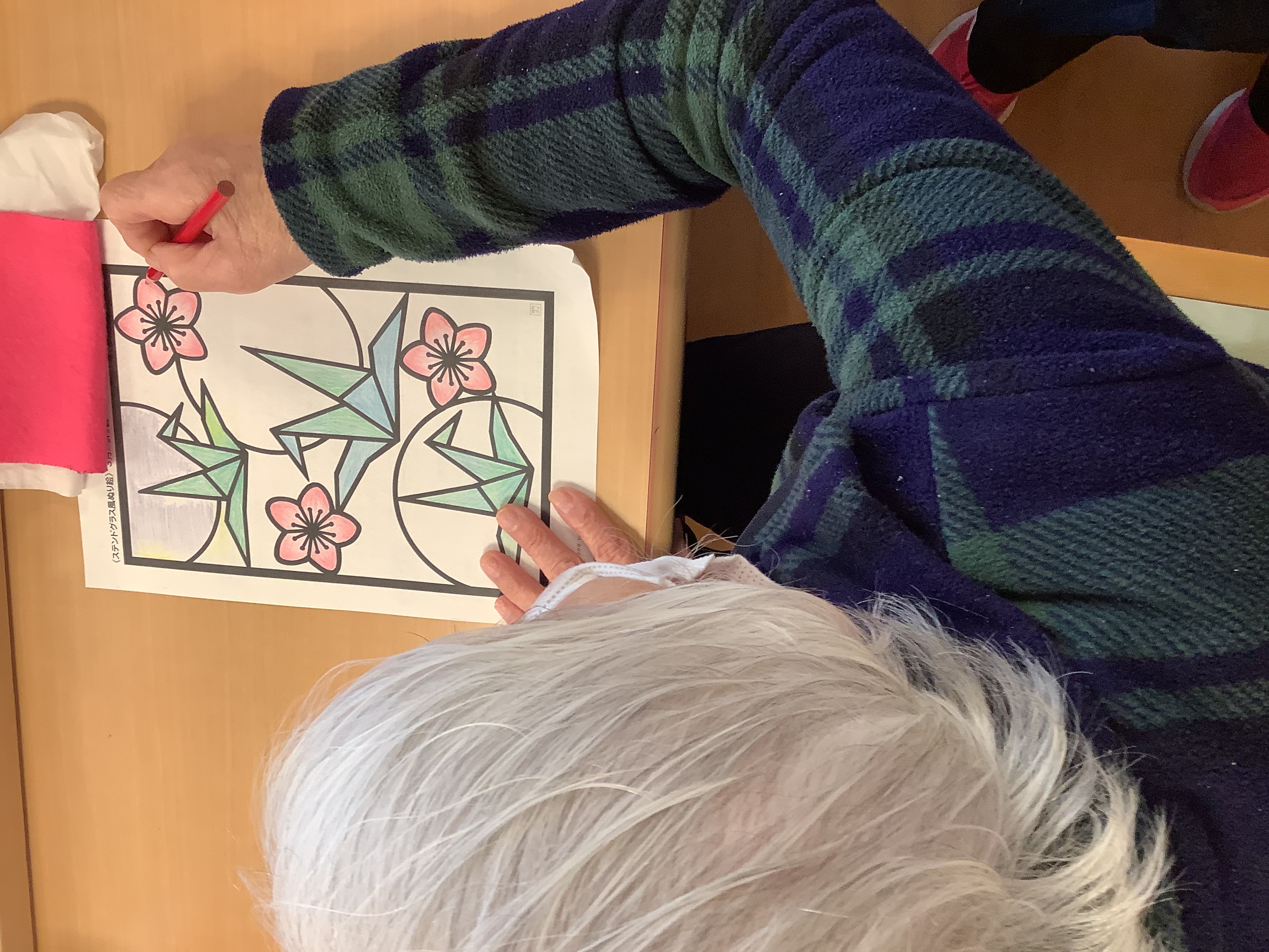 クラブ活動の時間に塗り絵を楽しまれている様子です(*^-^*)同じ塗り絵でも、1人1人違った作品が出来上がりました♬