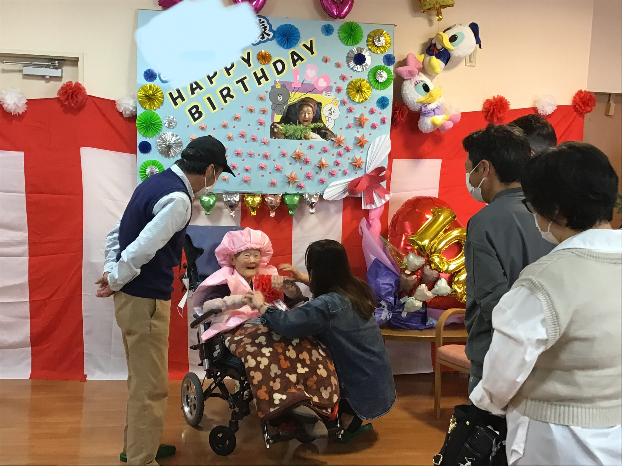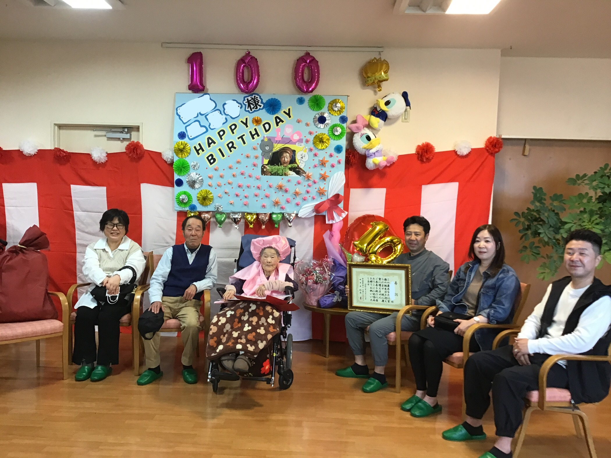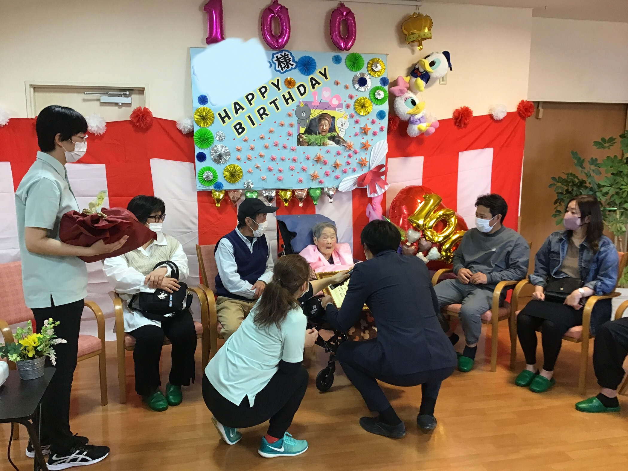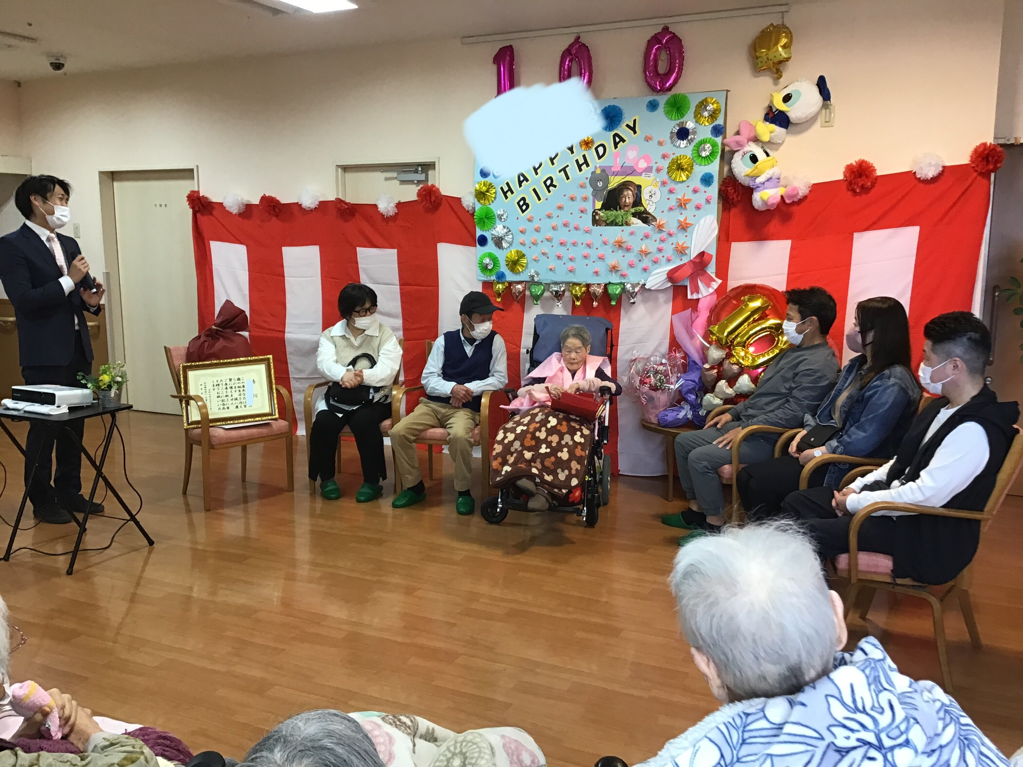 本日三階南ご利用者様の100歳を祝う会をご家族様にも来所して頂き開催させて頂きました(*^▽^*)