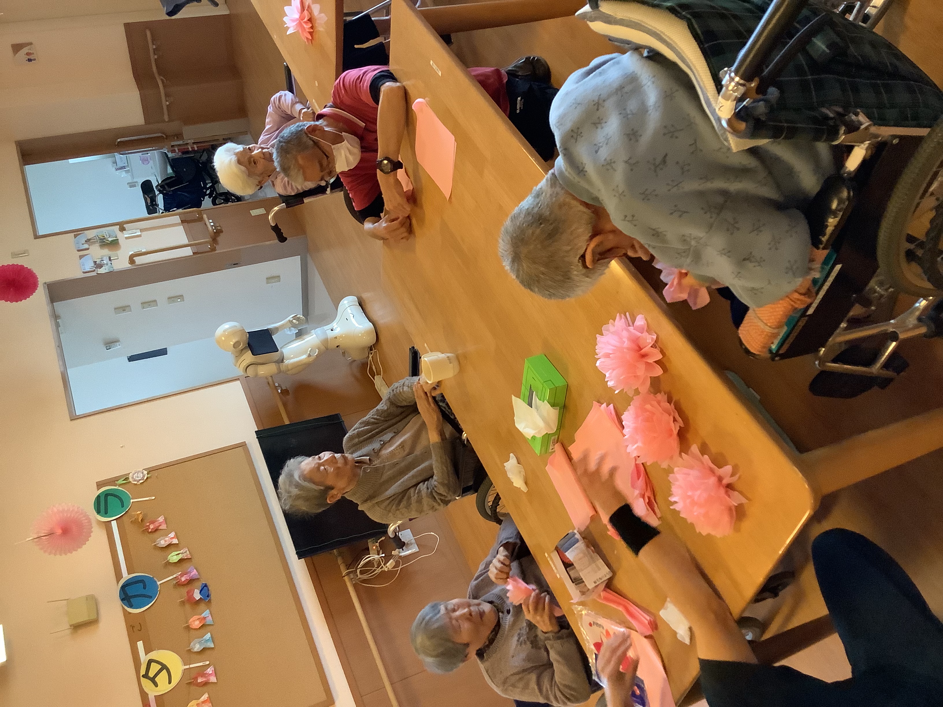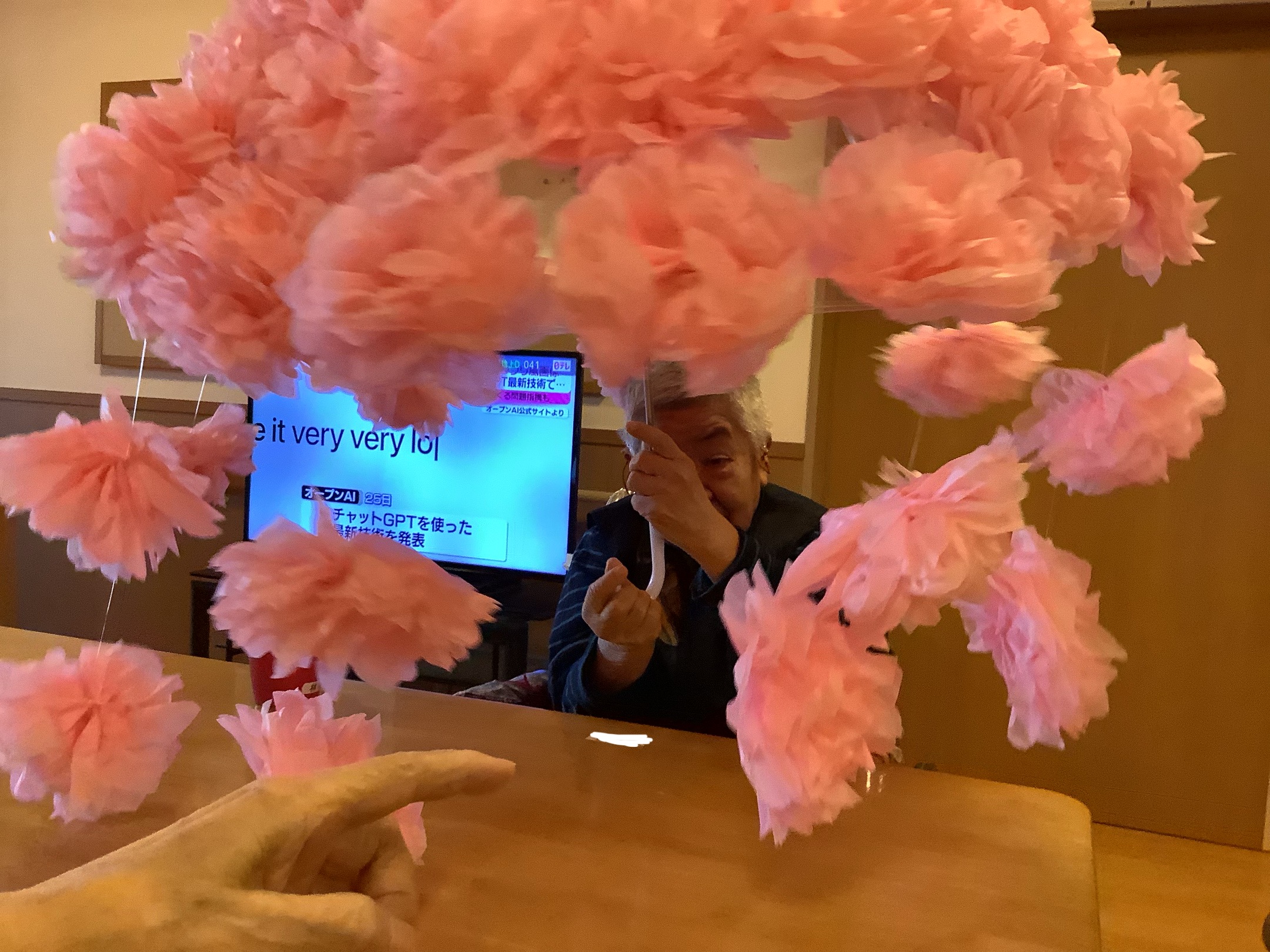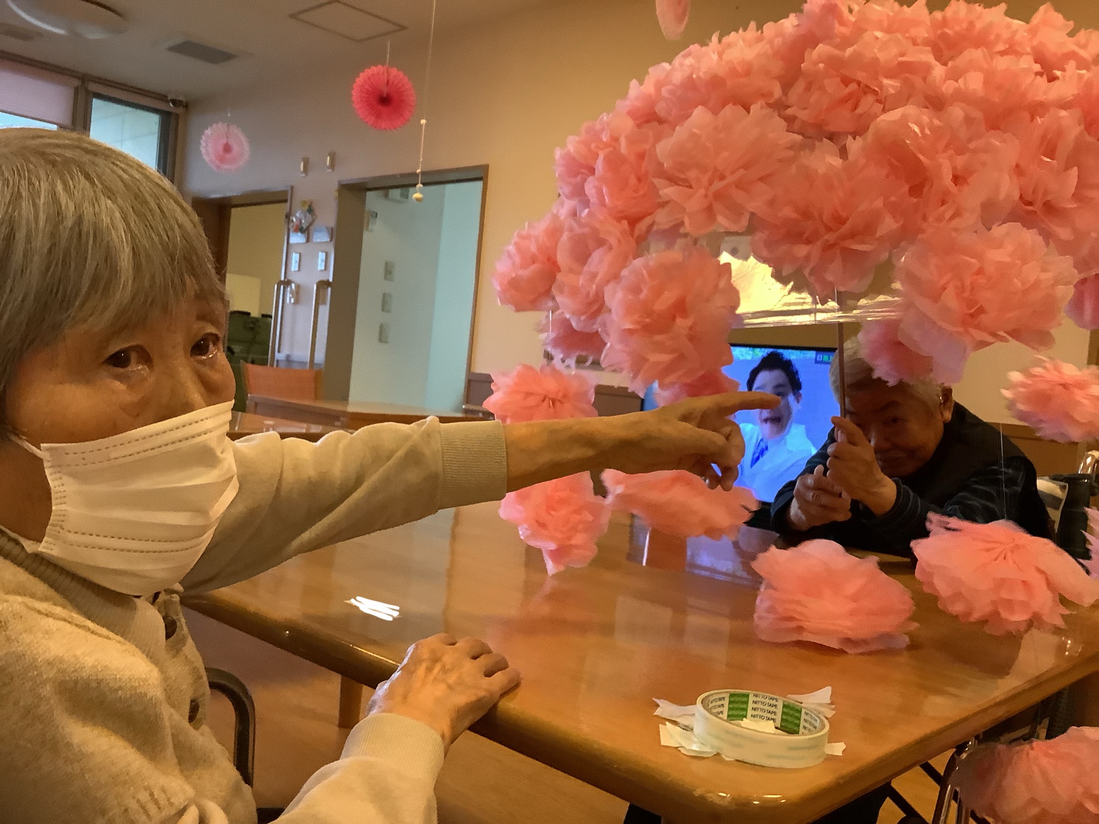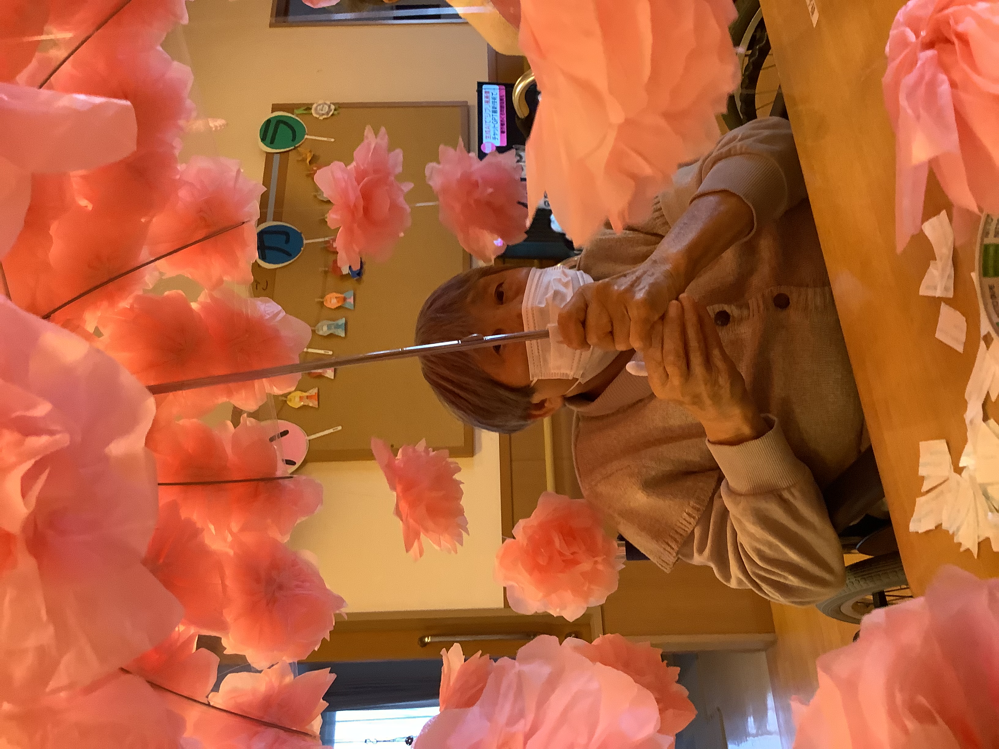 1人のご利用者様がペタペタとお花を貼ると、それを見ていたご利用者様が貼りやすいように位置を変えてくれたり、ここに貼れるよと声を掛けてくれたり(^-^)