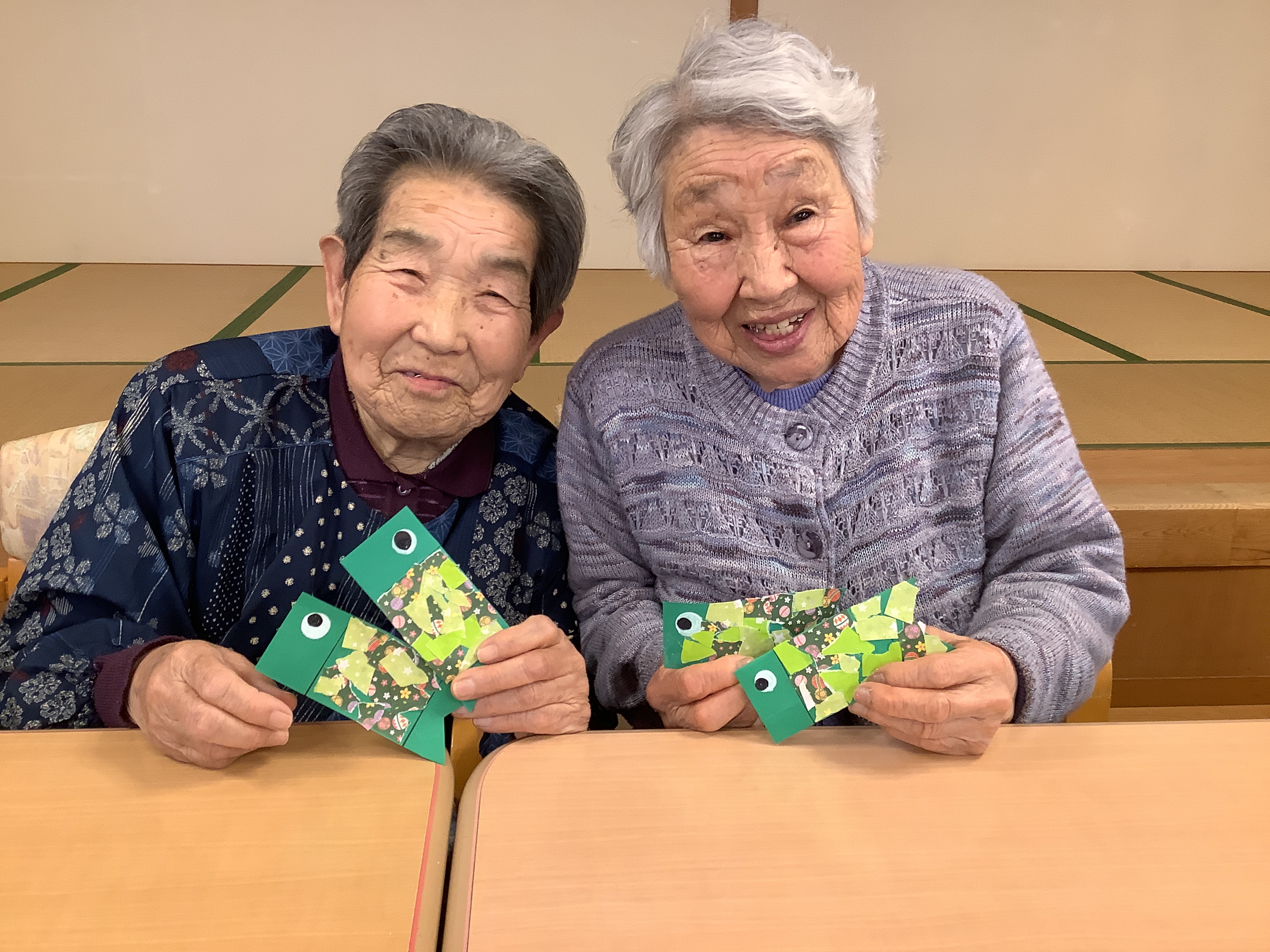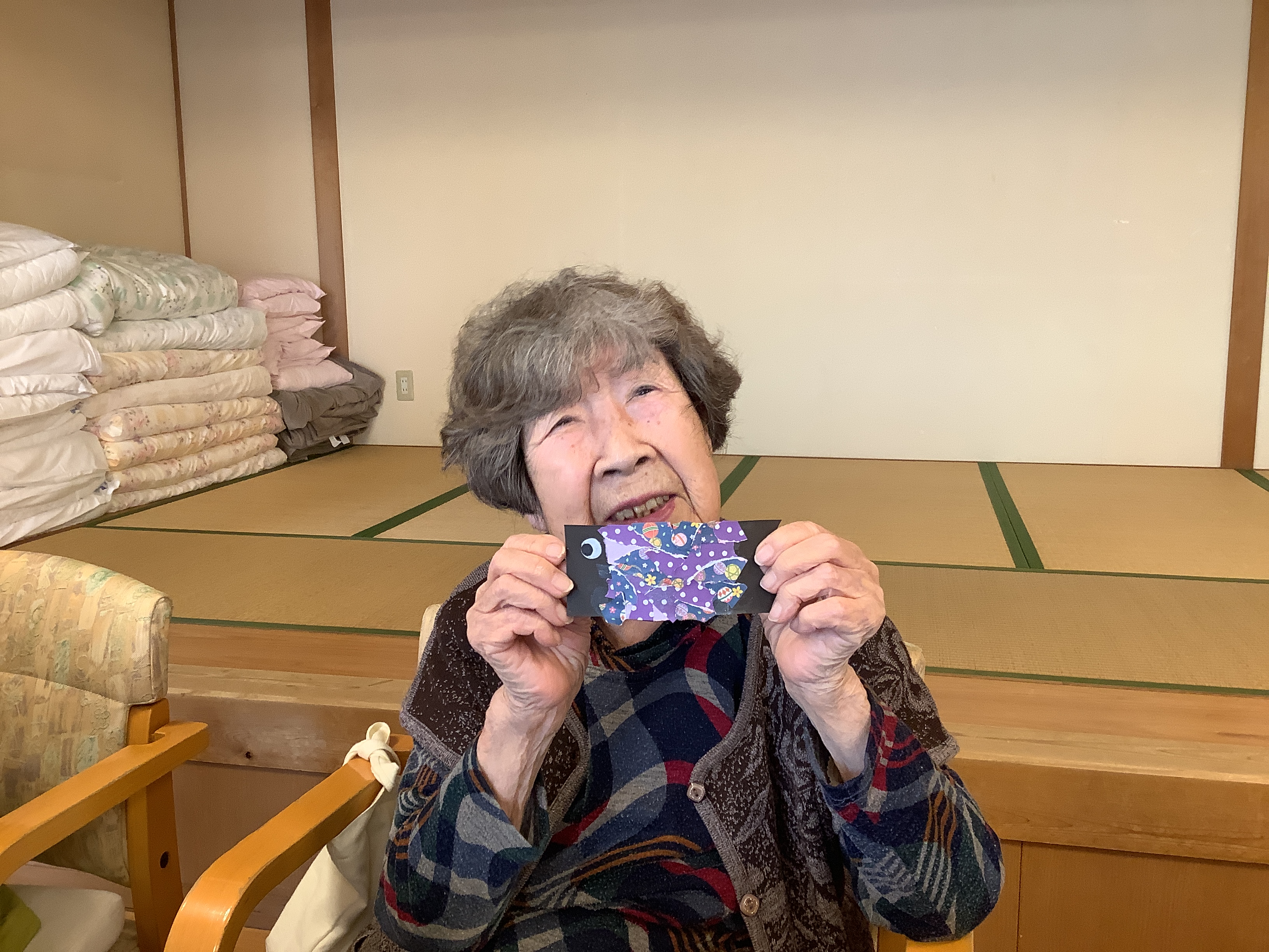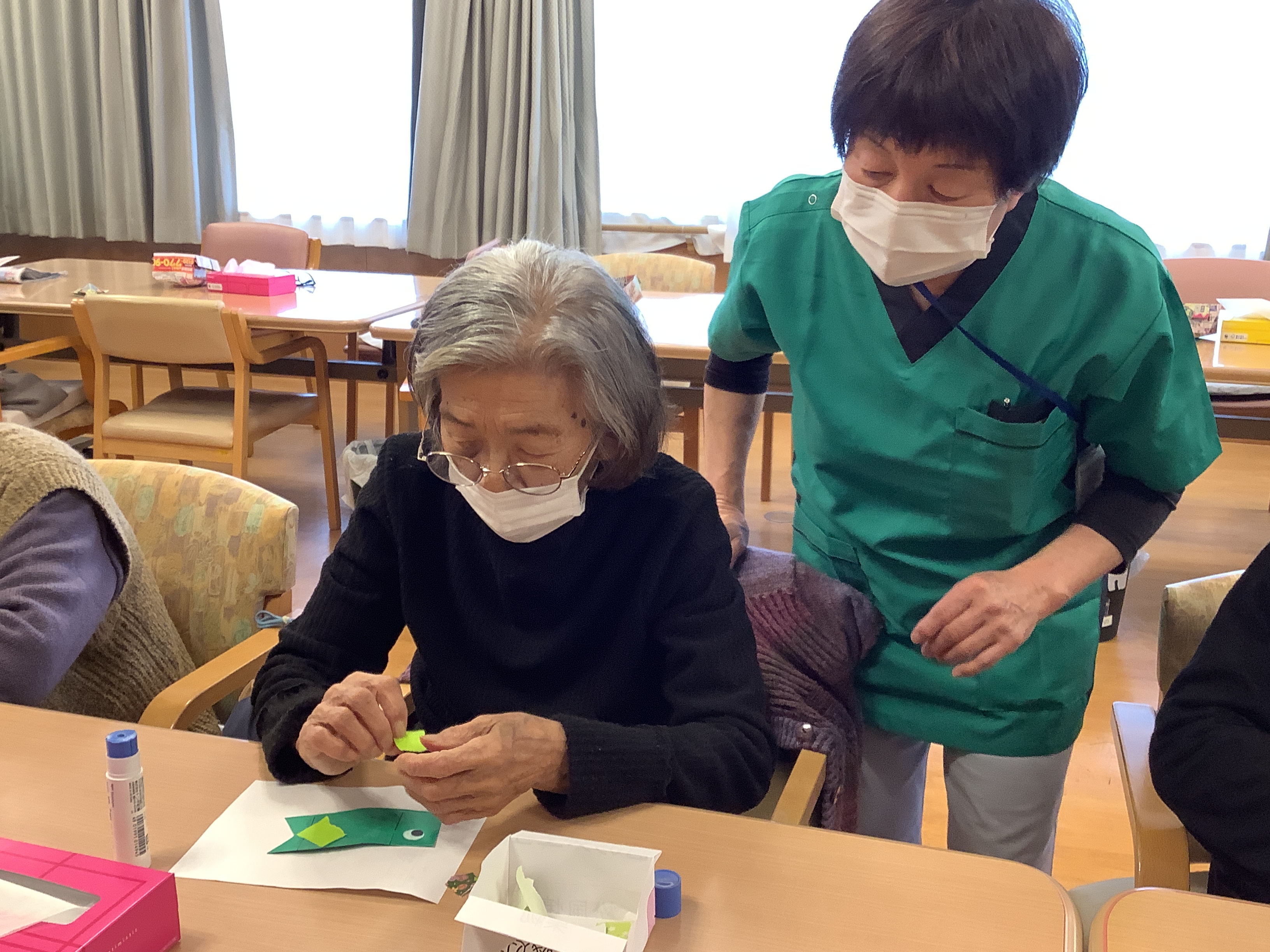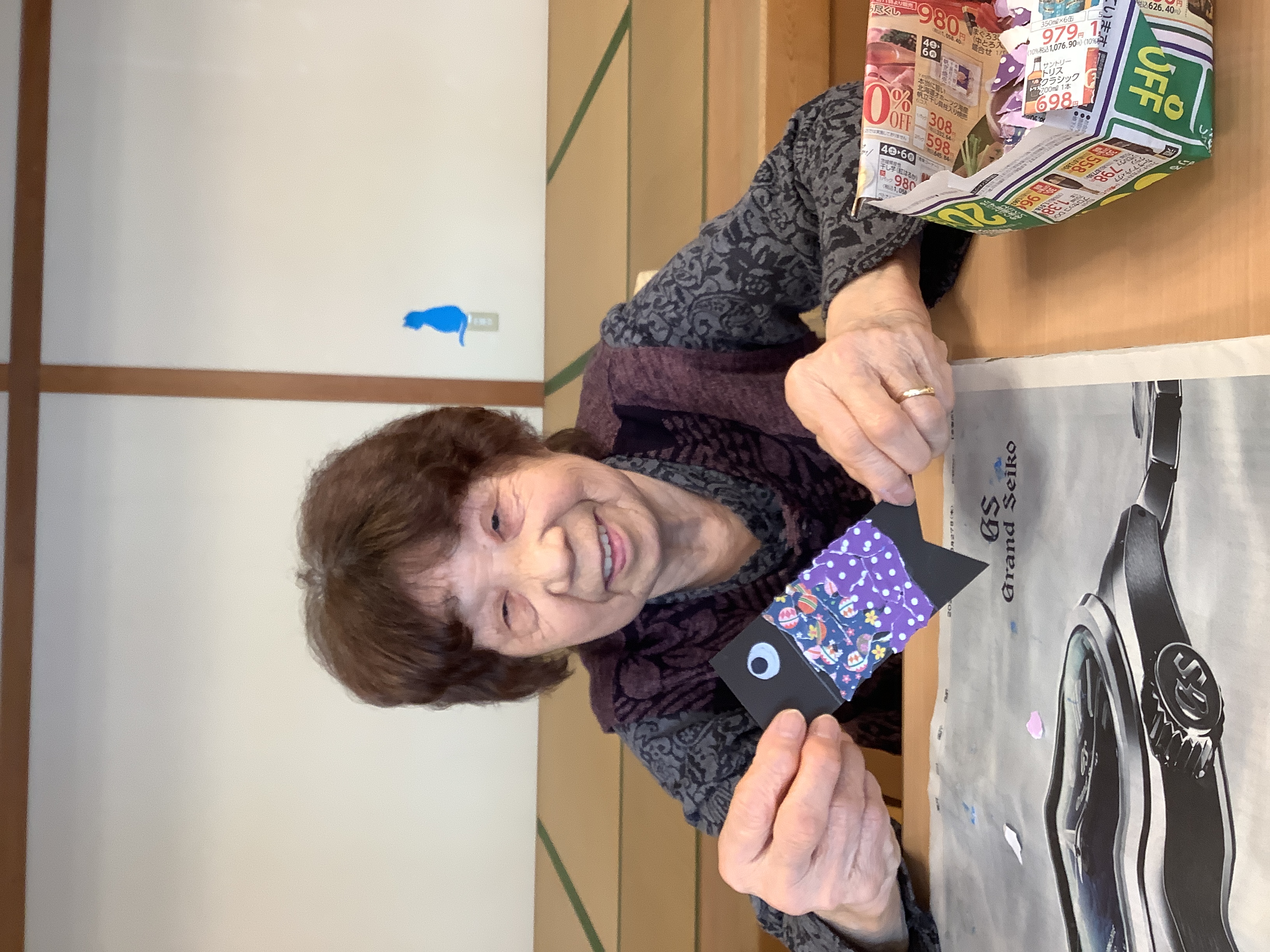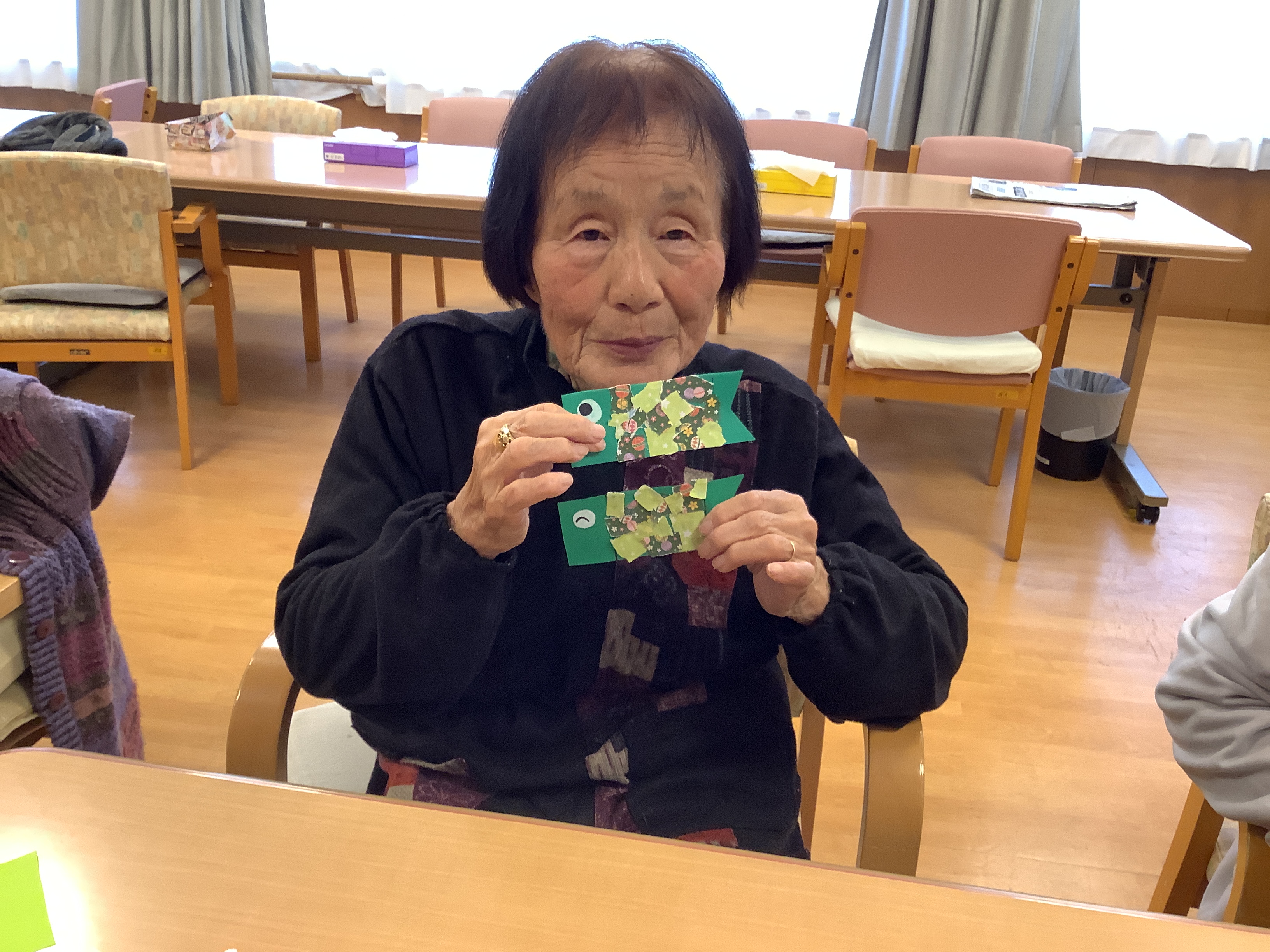 施設の桜が開花し始めたばかりですが、一足早く鯉のぼりの制作をしました。色々な鯉のぼりが出来上がっています。完成が楽しみです。