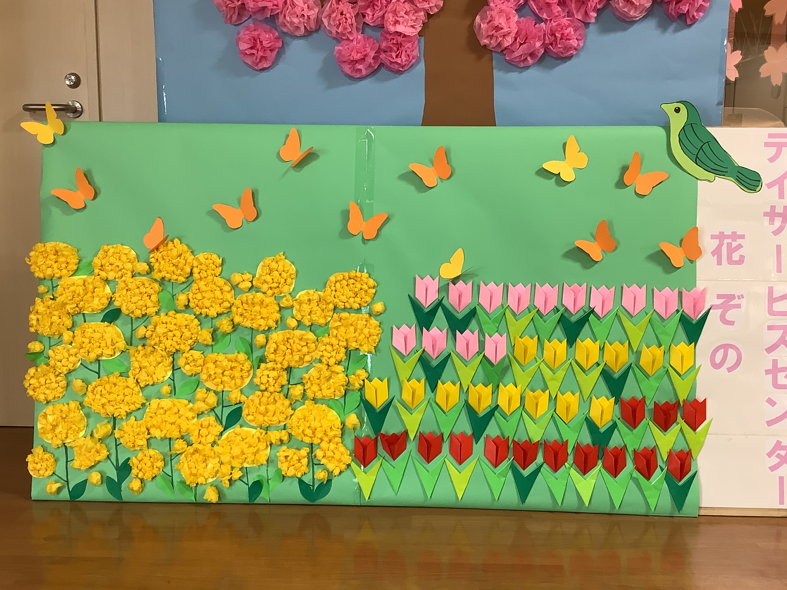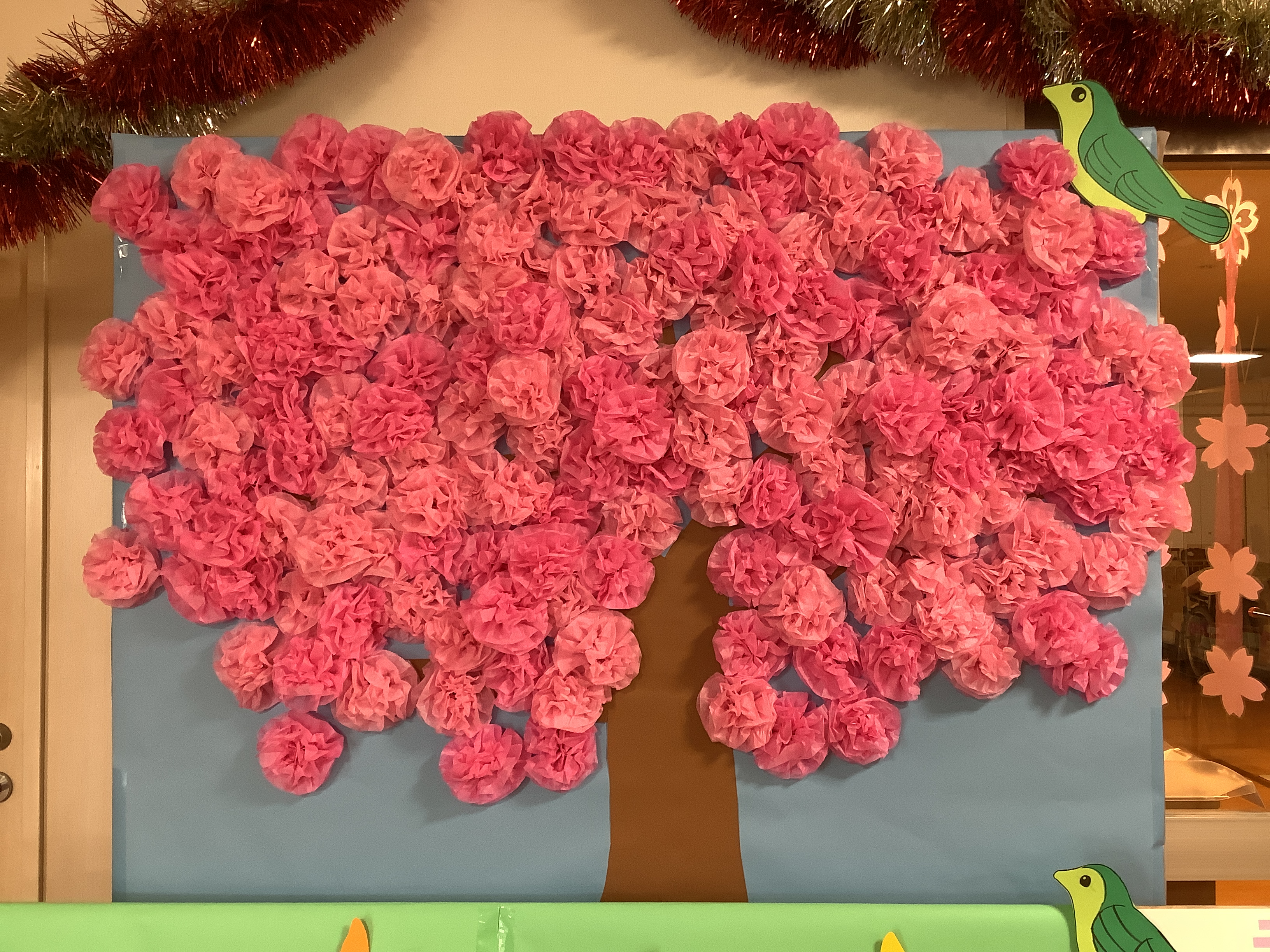 デイサービス入口の壁面が春になりました!(^^)! 利用者様たちが作って下さった桜が満開♪