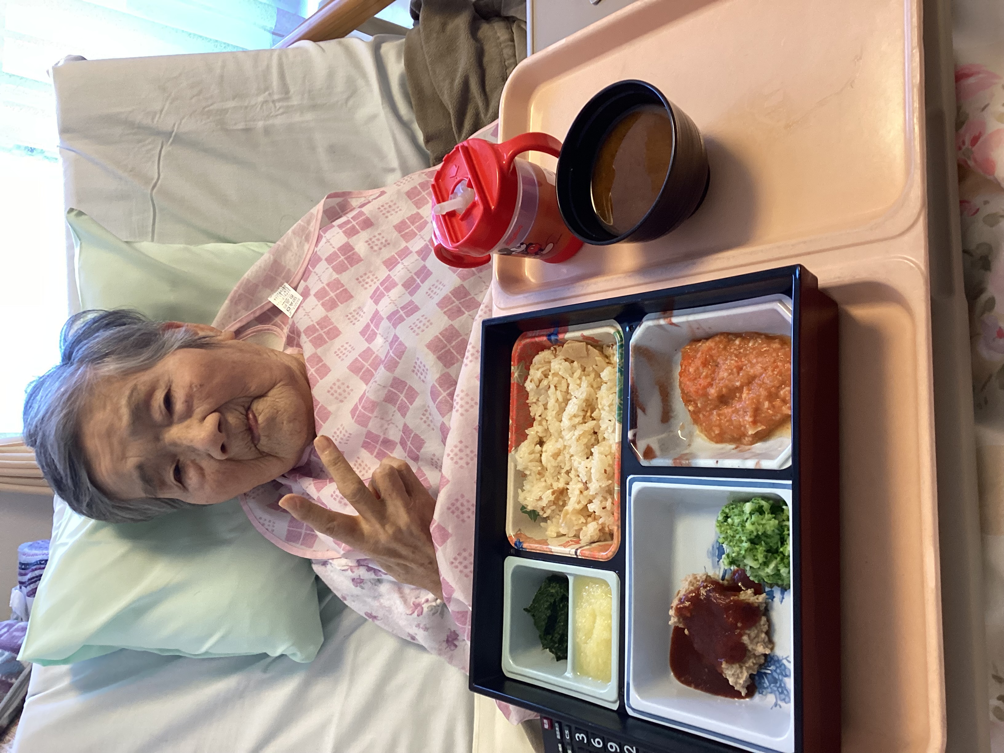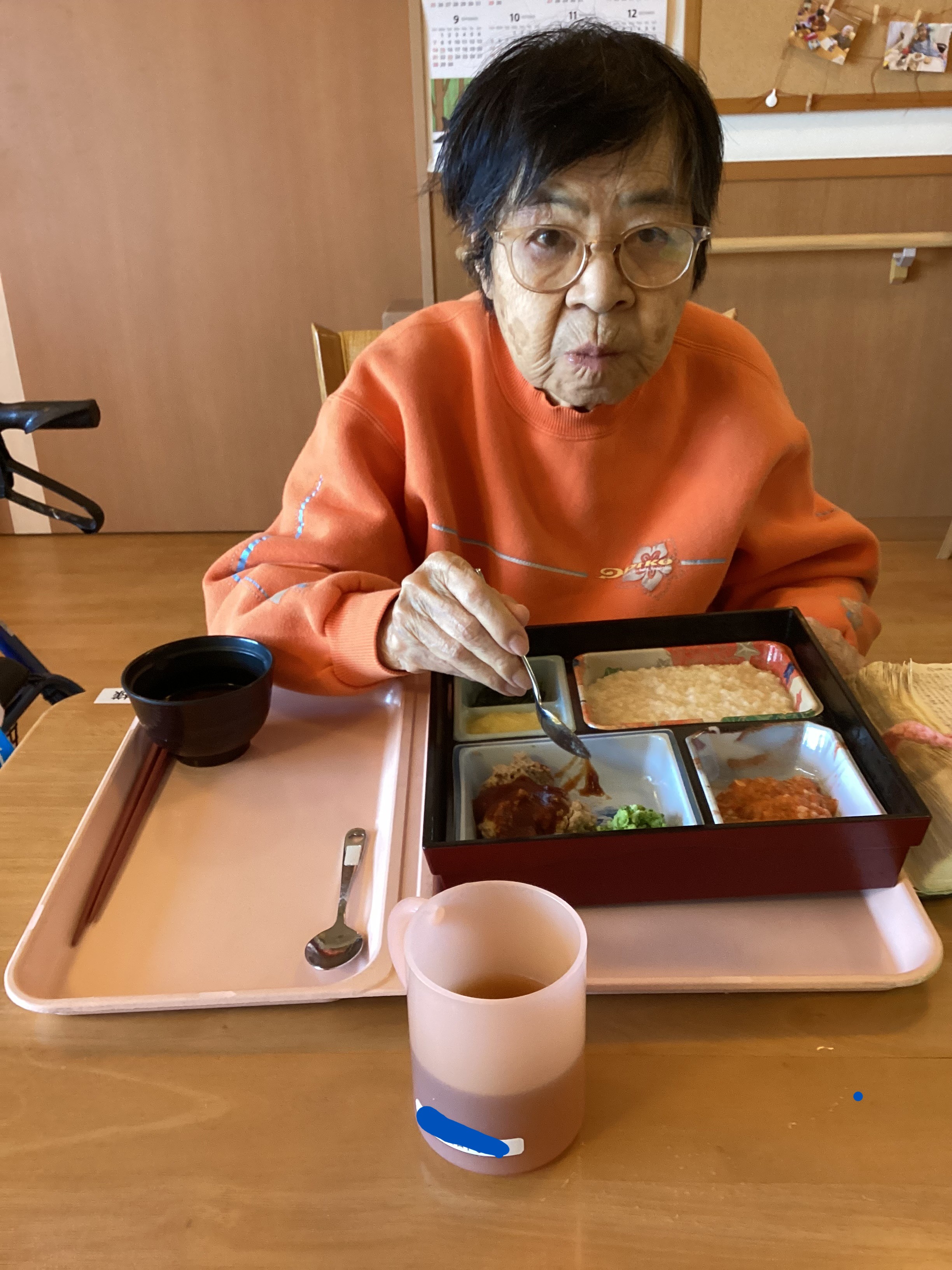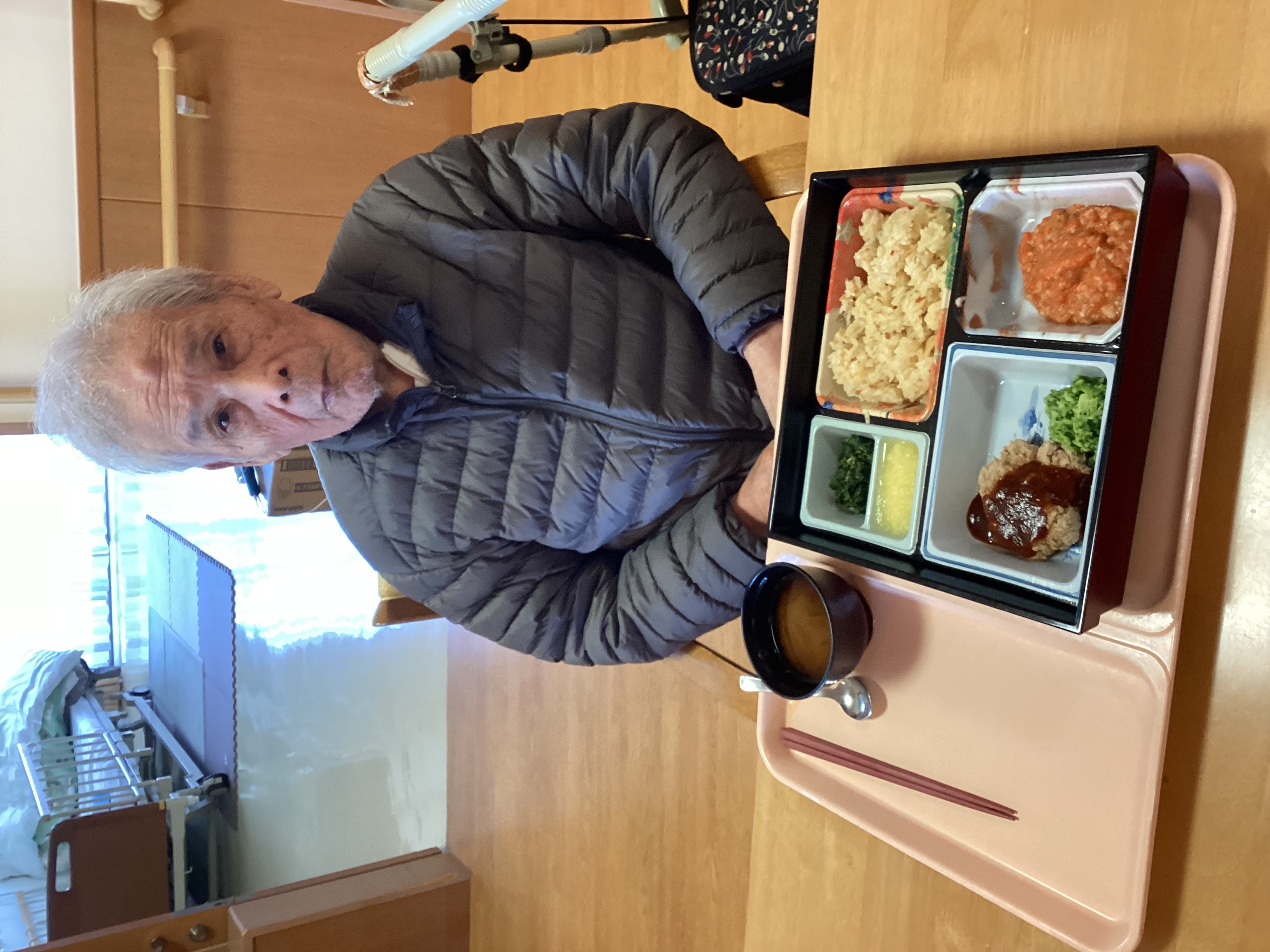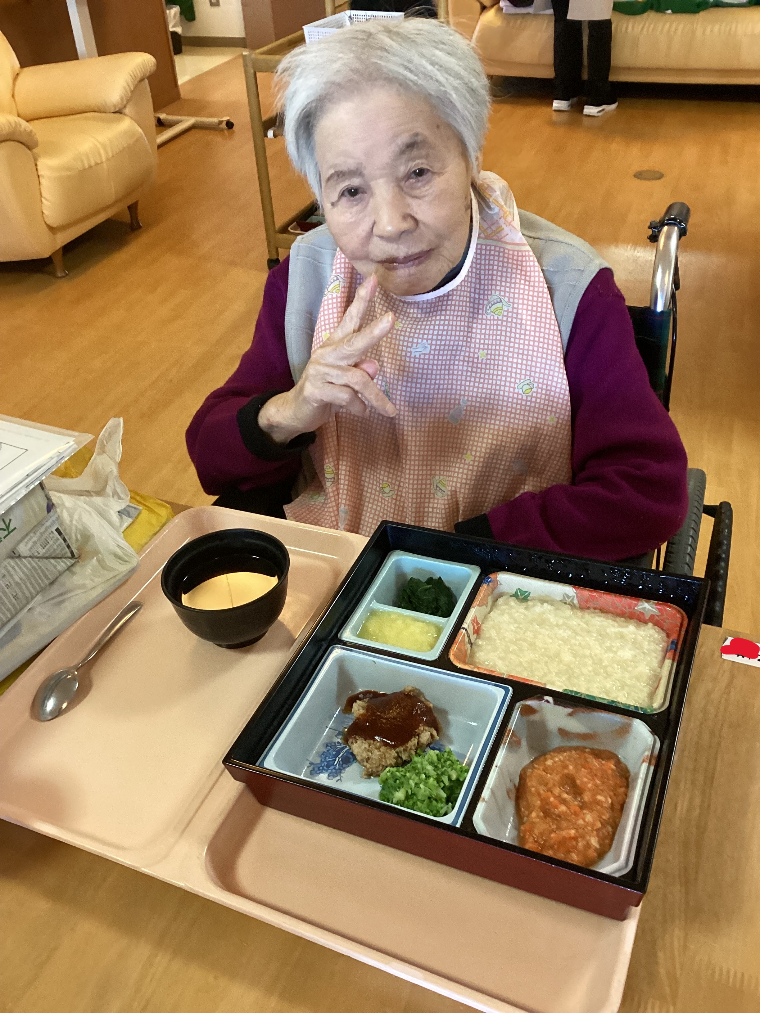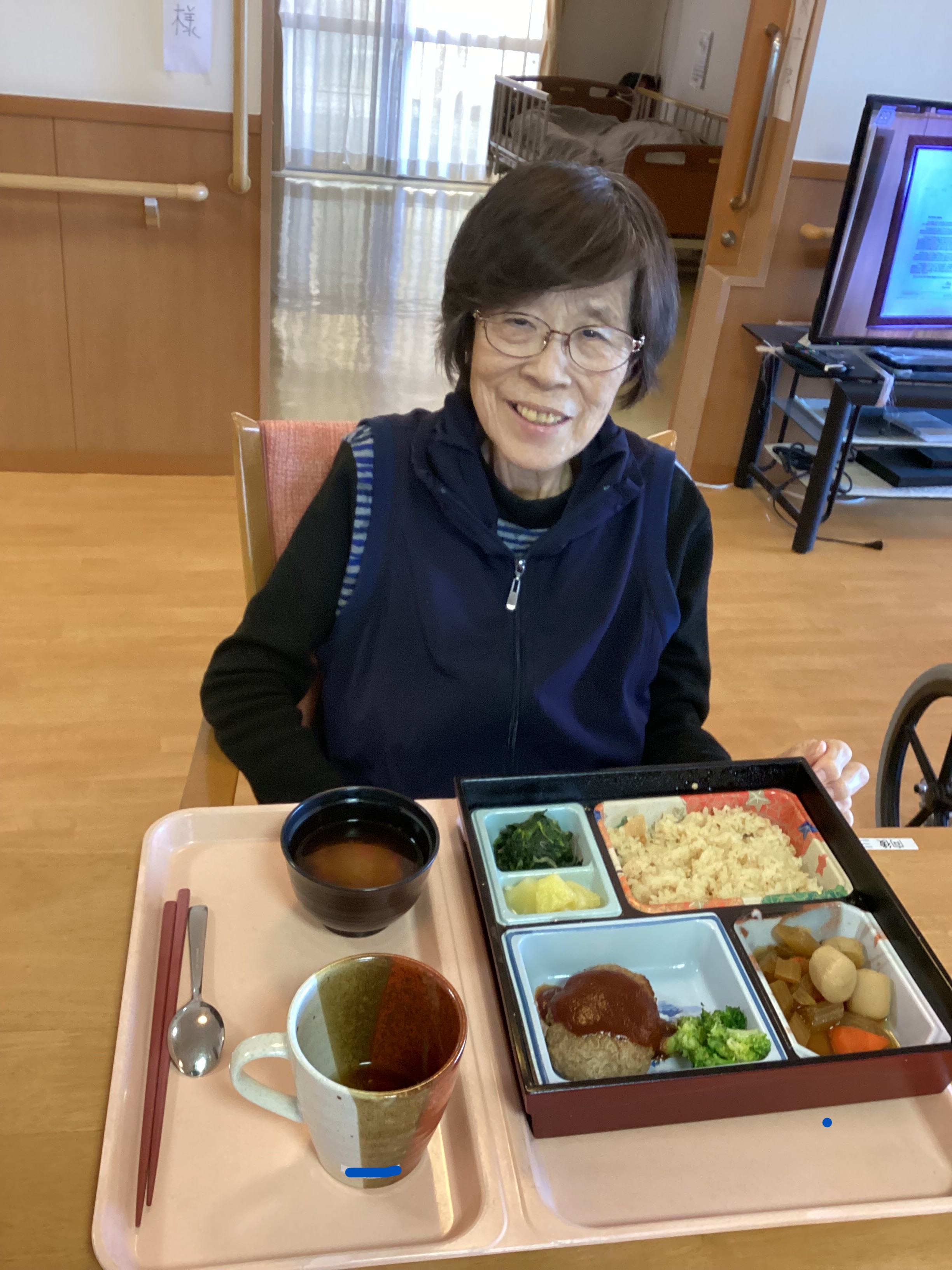 筍ご飯、ハンバーグ、ほうれん草のなめ茸和え等